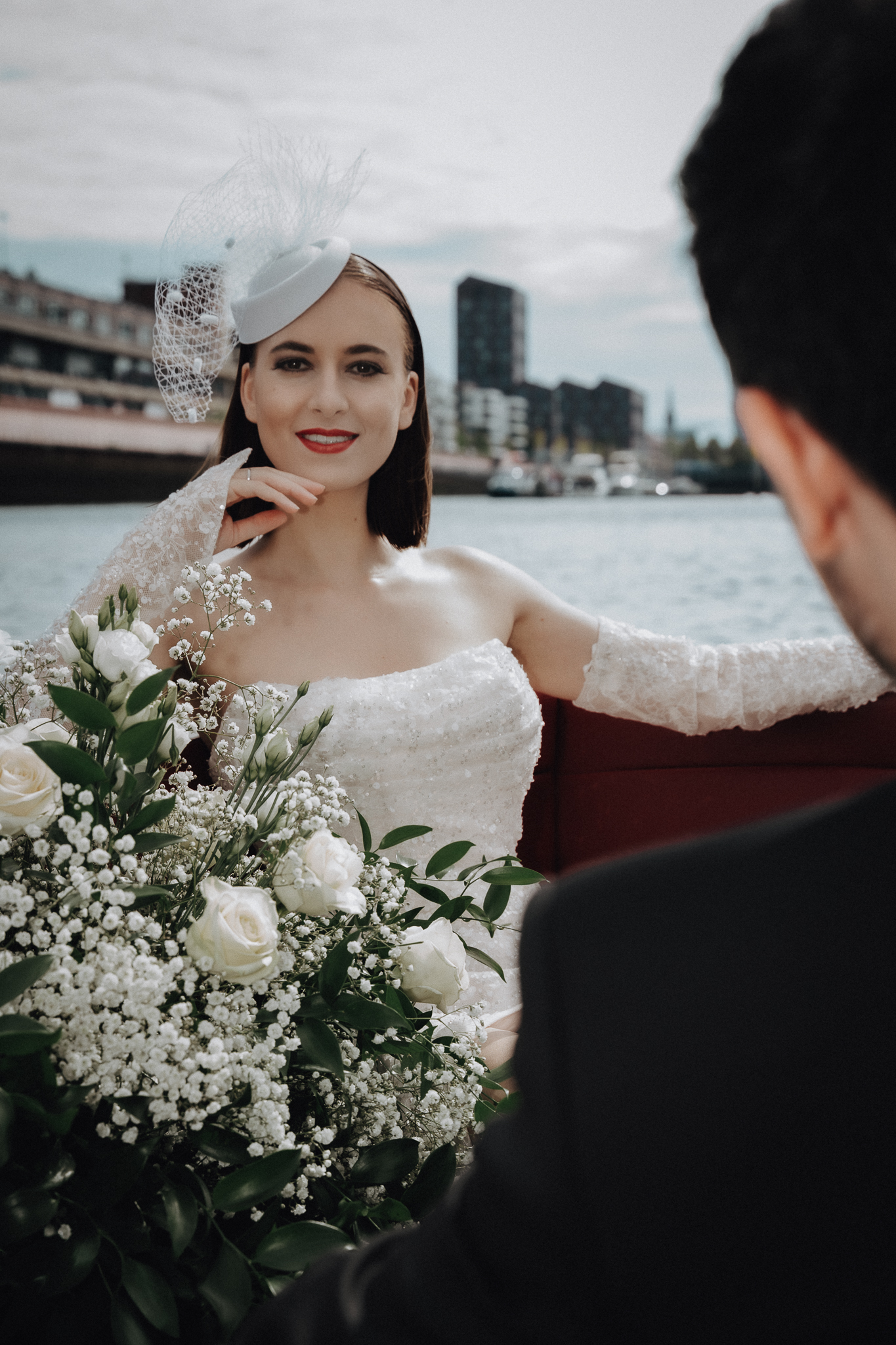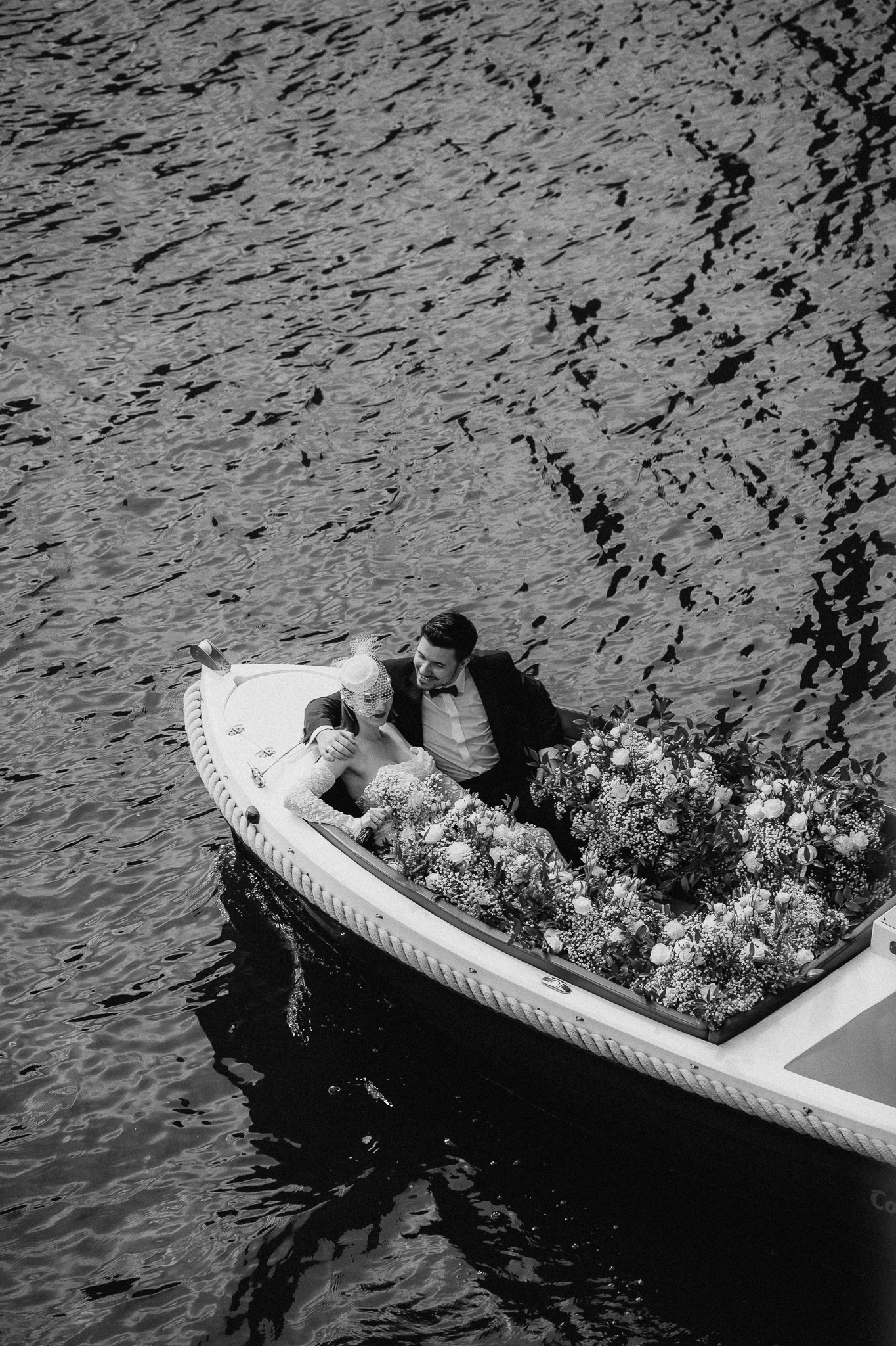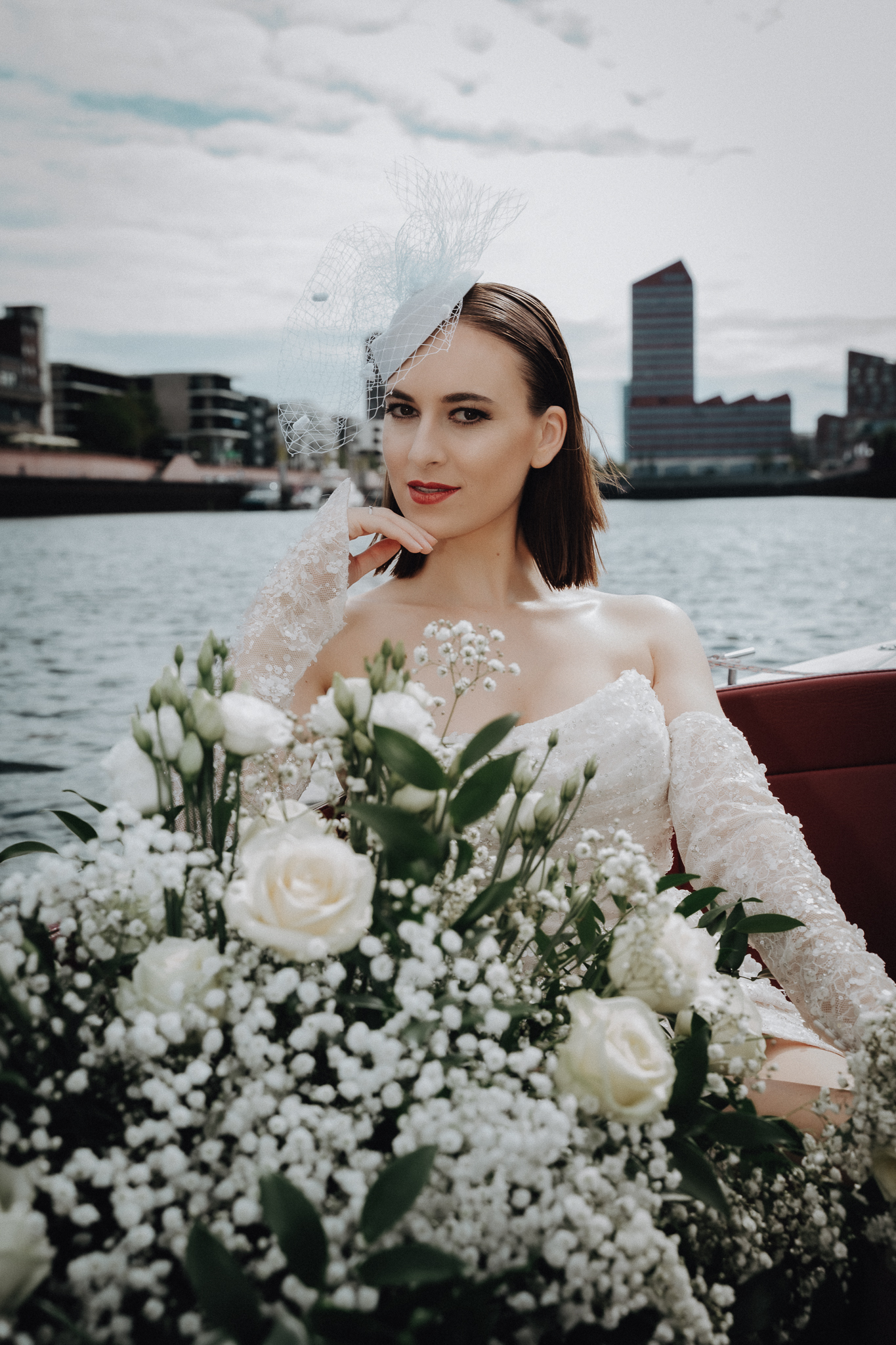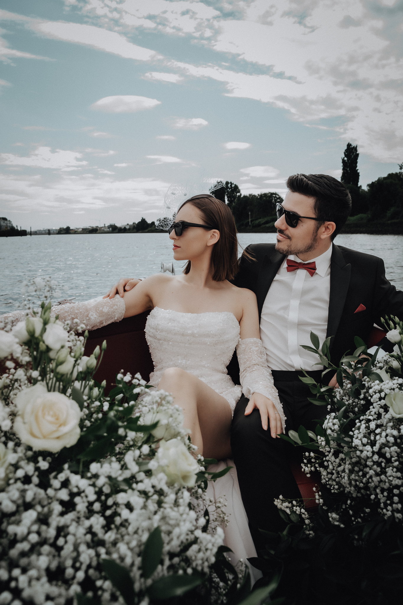 Die Floristik ist ein Inbegriff zeitloser Schönheit – üppige, weiße Rosen, zartes Schleierkraut und edler Ruscus verschmelzen zu einer Komposition voller Leichtigkeit und Eleganz. Auf dem Boot perfekt inszeniert, wirken die floralen Arrangements wie ein schwebender Garten auf dem Wasser – pur, stilvoll und von natürlicher Raffinesse.