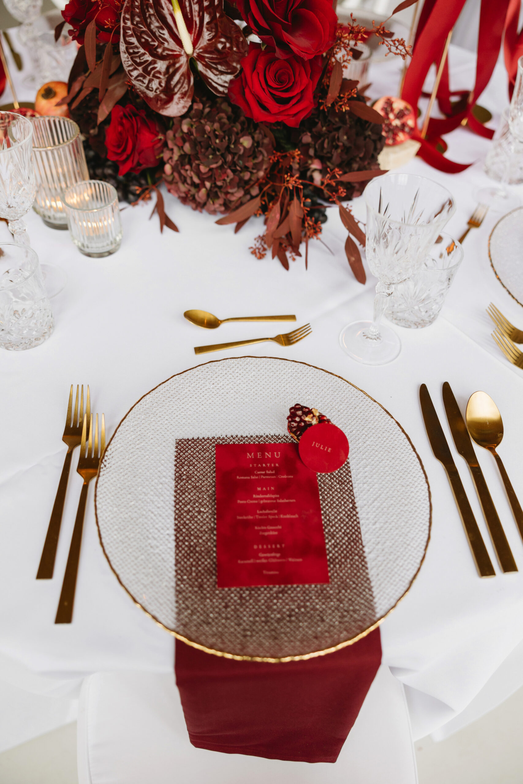 Feines Porzellan, goldveredeltes Besteck und Stoffservietten in Burgundertönen bilden die elegante Basis. Kristallgläser und sanfte Strukturen runden das Bild ab und lassen die Farben harmonisch miteinander verschmelzen.