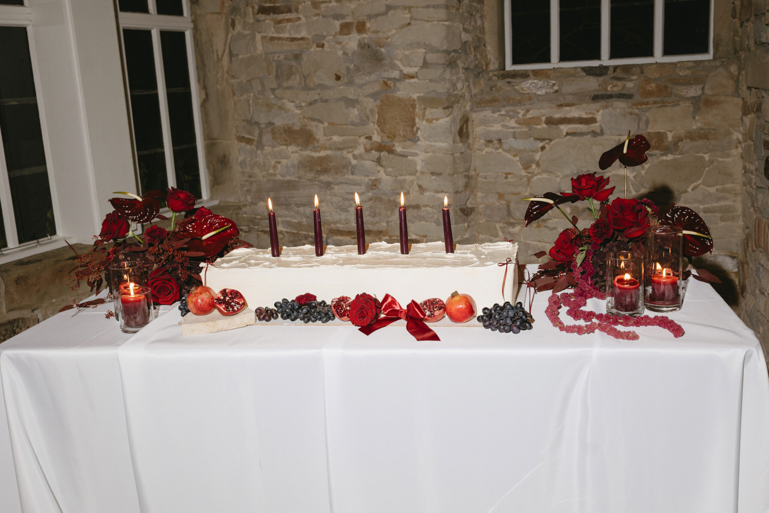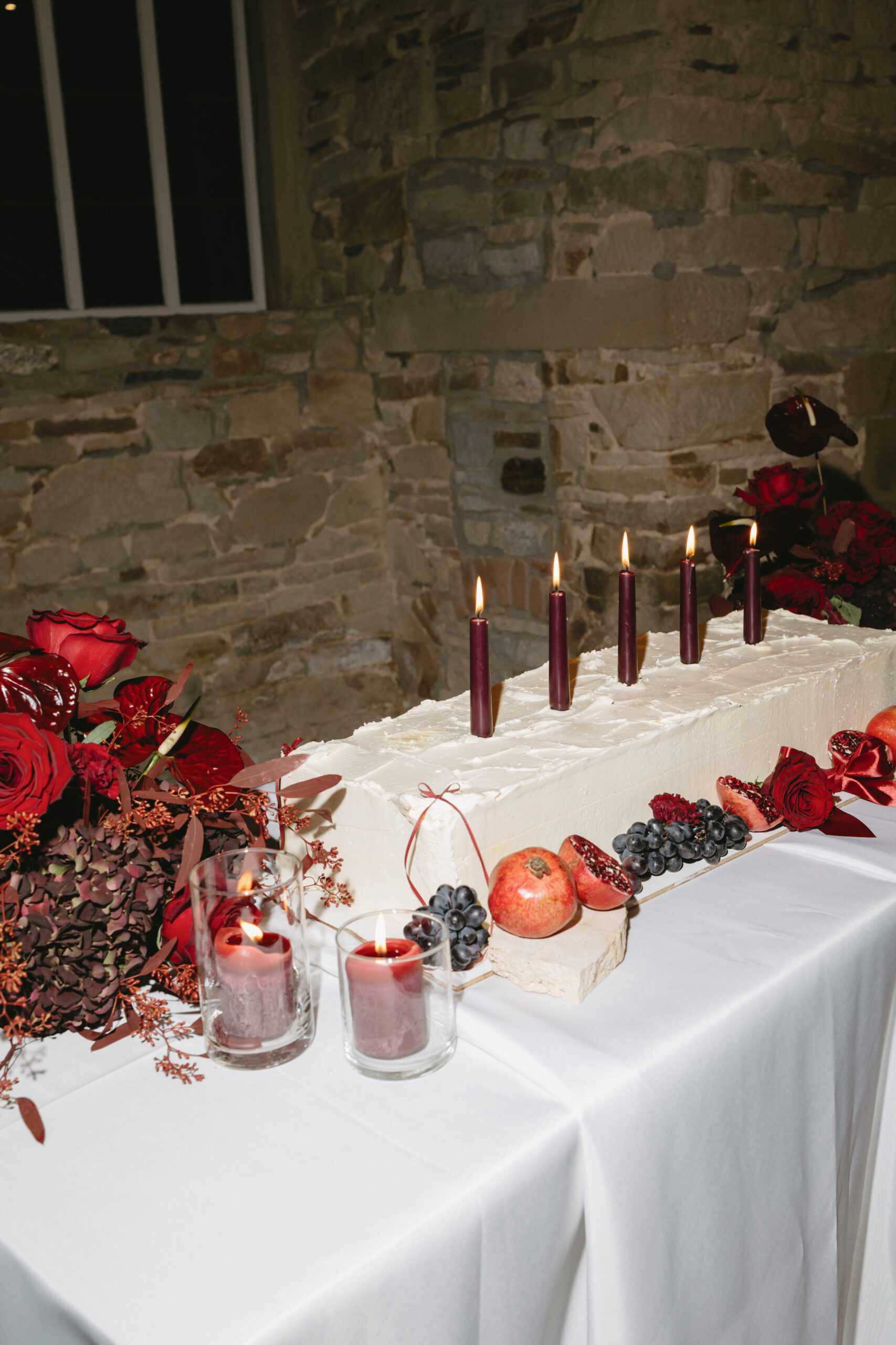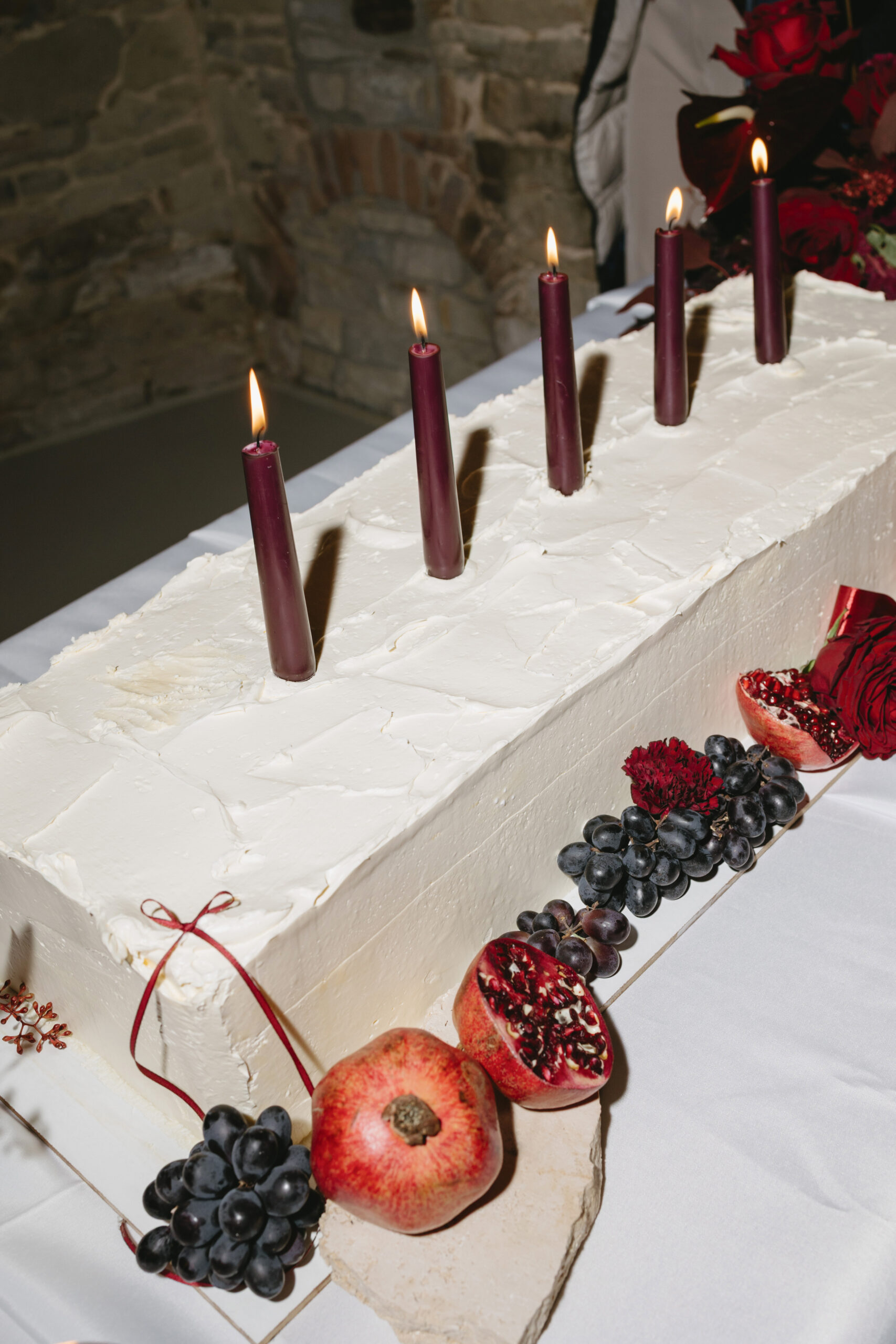 Auf der Torte sorgen burgunderfarbene Stabkerzen für ein atmosphärisches Setting. Ihr warmes, sanftes Licht spiegelt sich im Glanz der Granatapfelkerne und lässt das Tortendetails noch intensiver wirken.