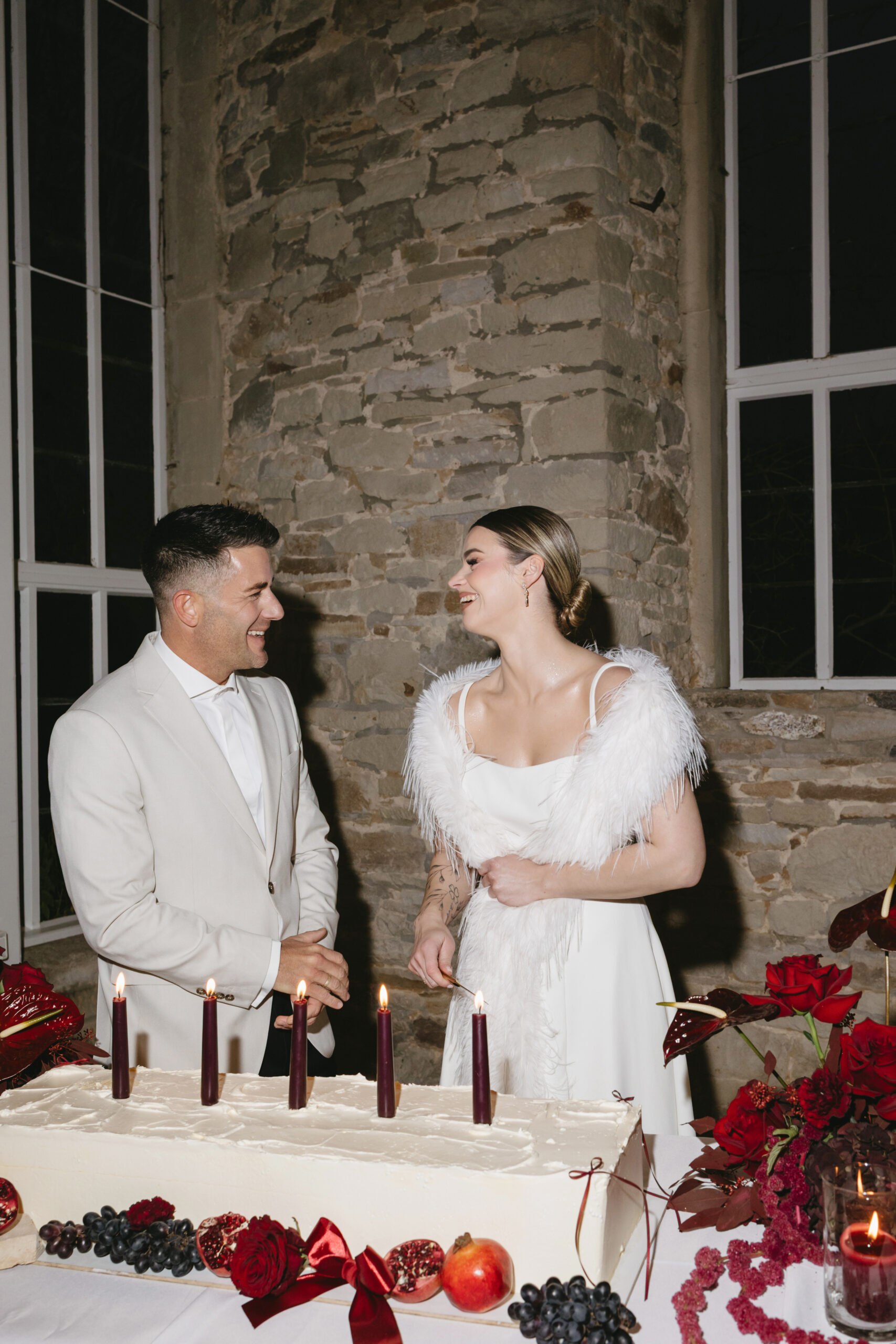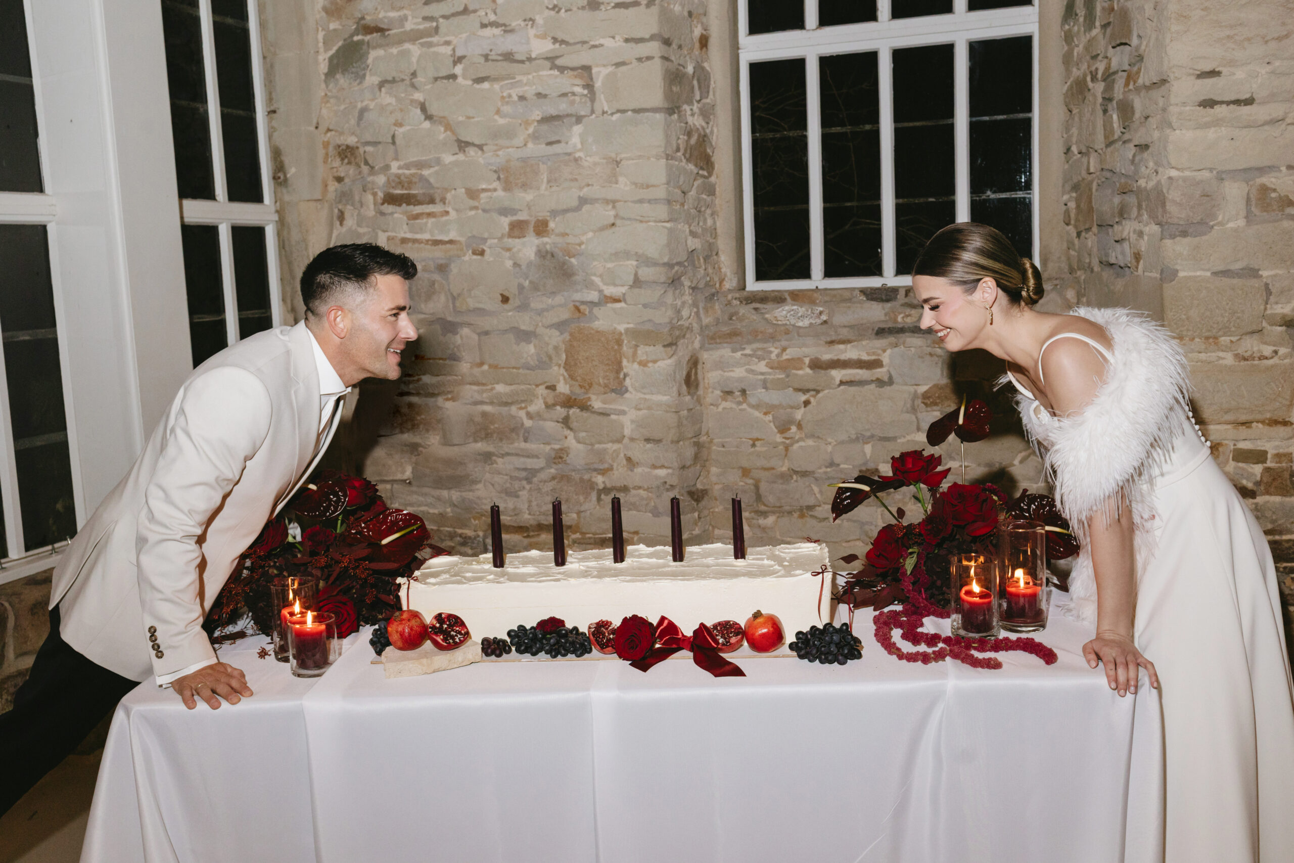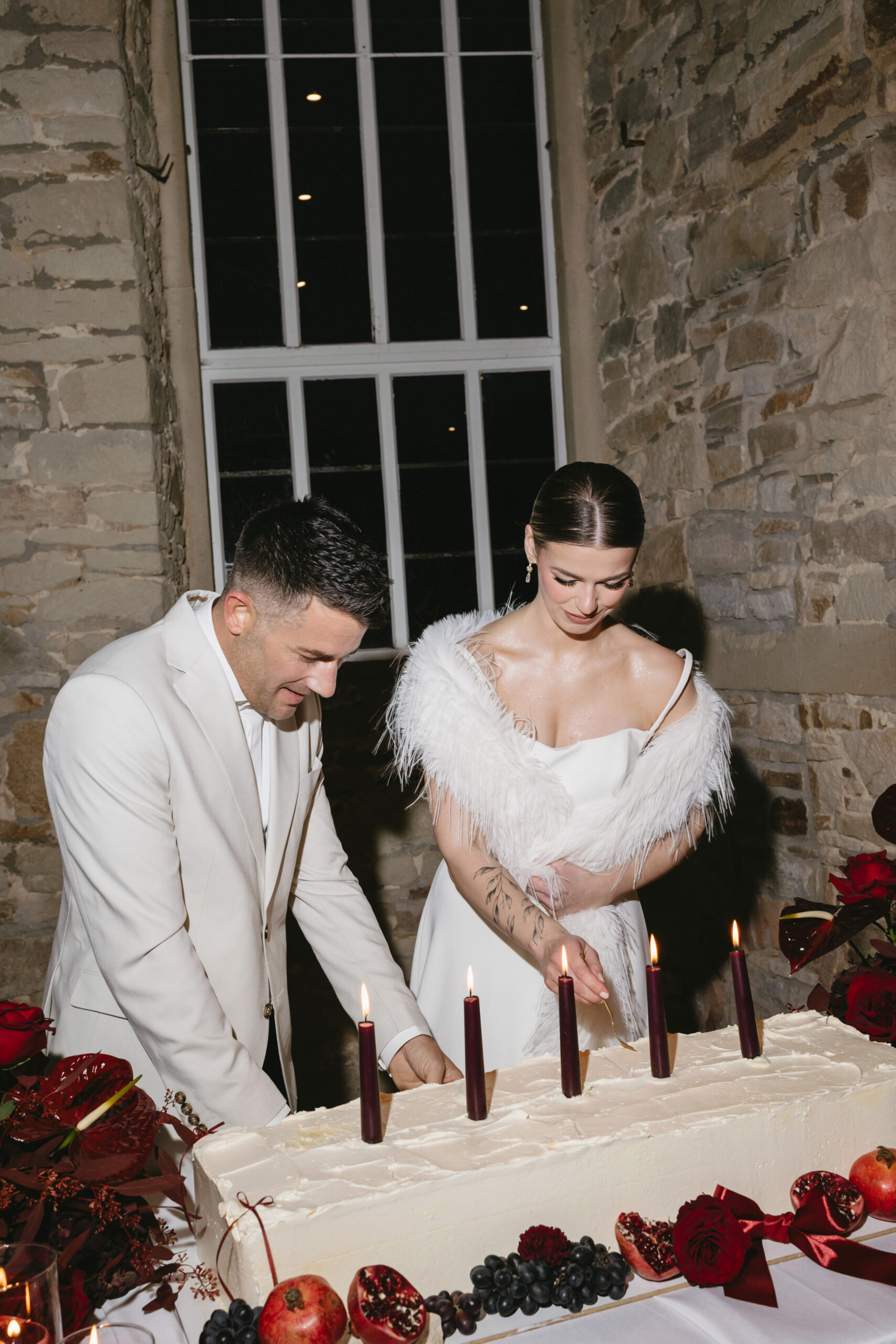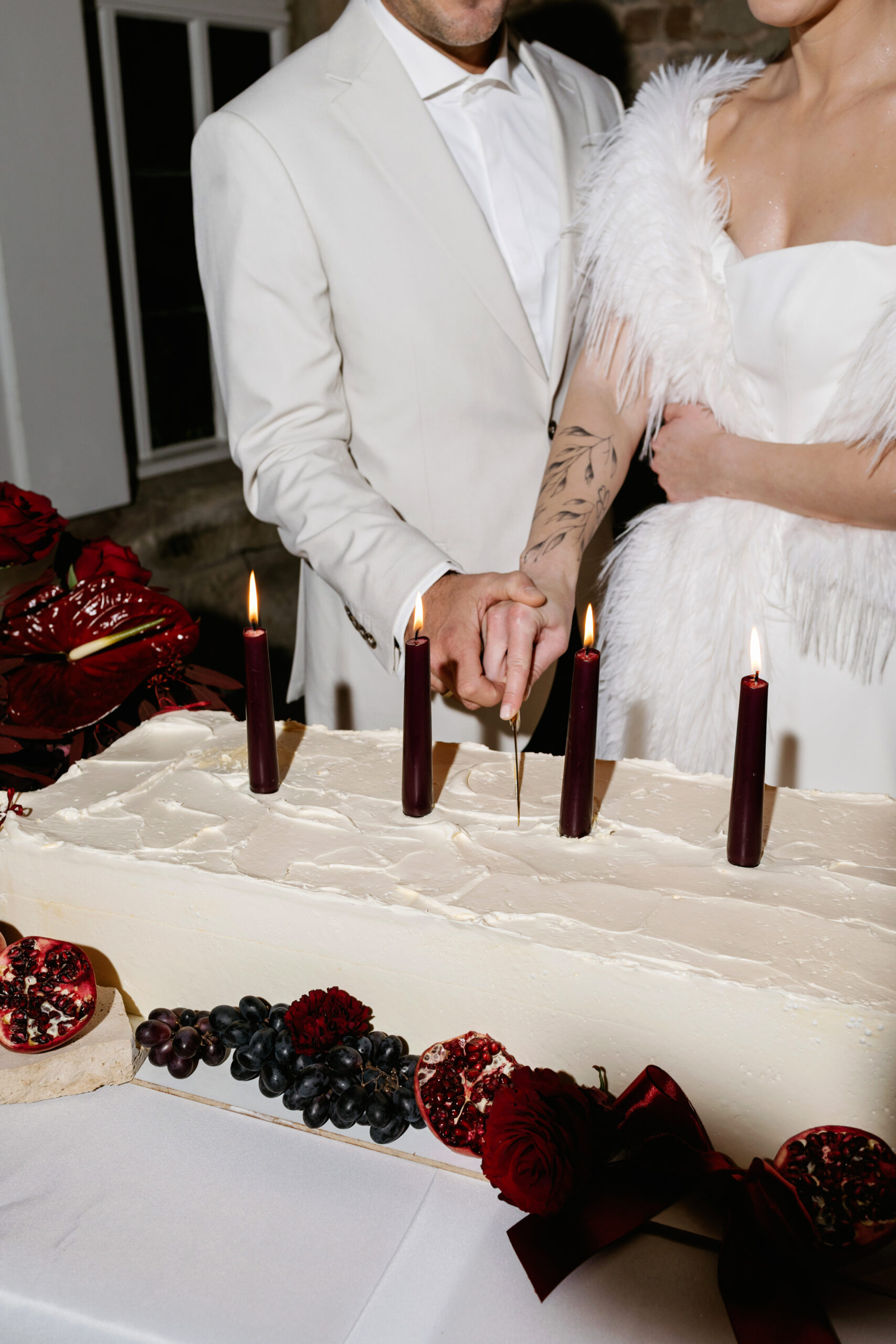 Auf der Torte sorgen burgunderfarbene Stabkerzen für ein atmosphärisches Setting. Ihr warmes, sanftes Licht spiegelt sich im Glanz der Granatapfelkerne und lässt das Tortendetails noch intensiver wirken.