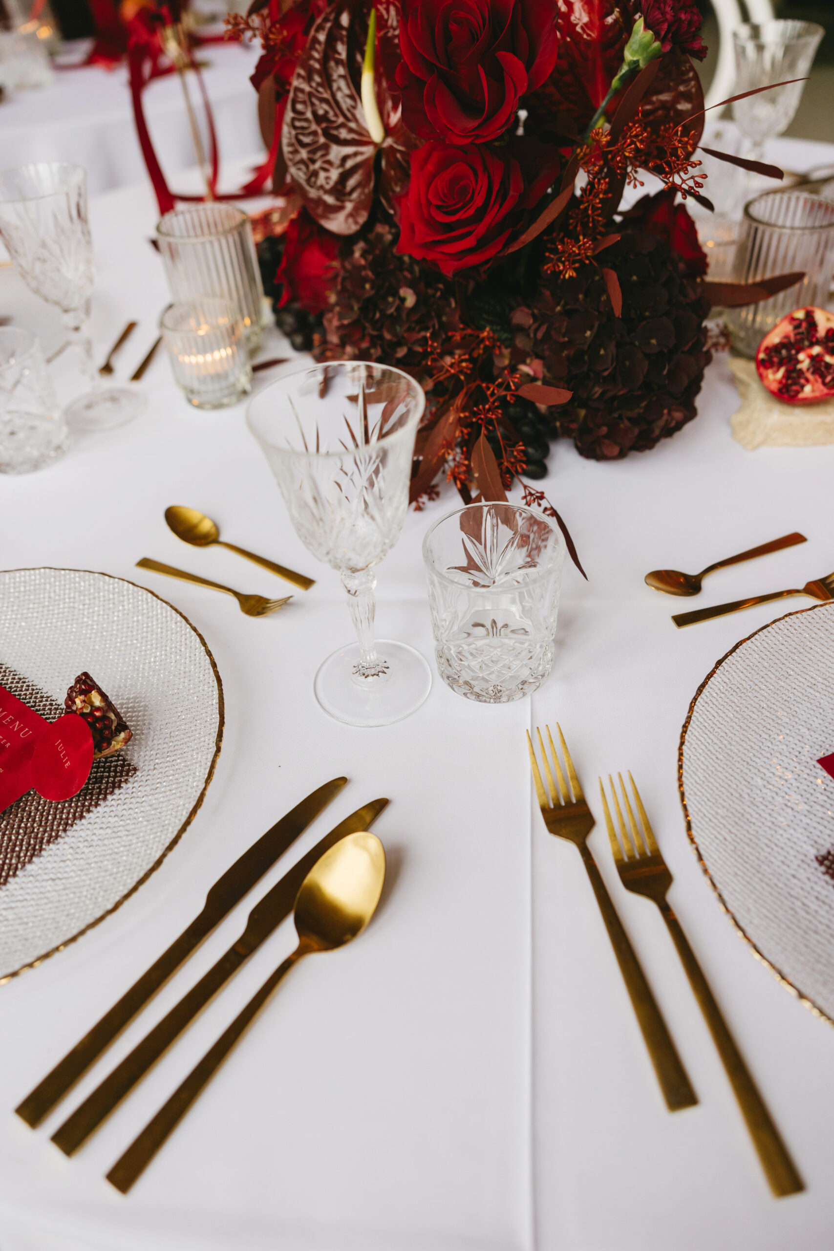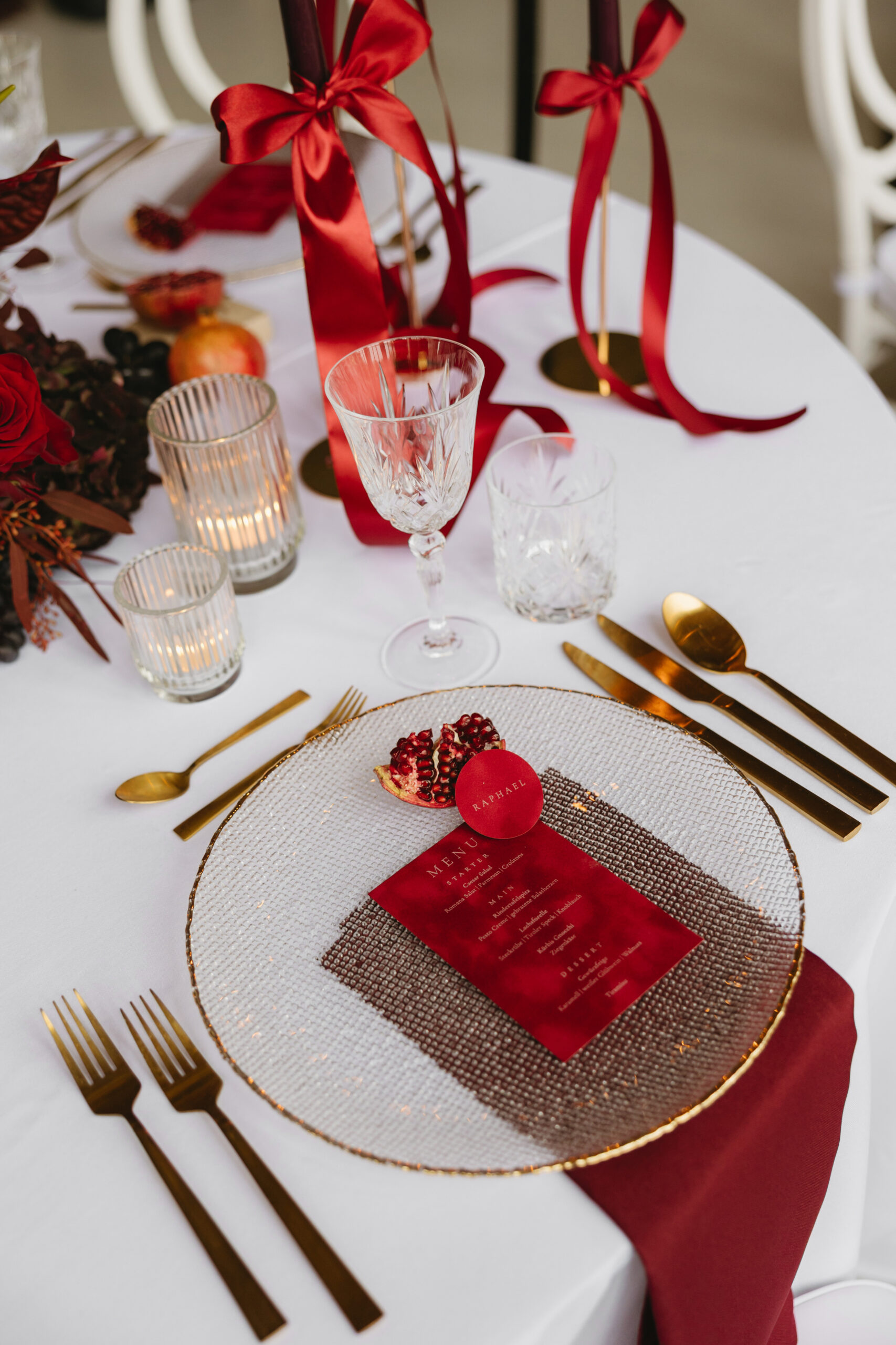 Das Tischsetting strahlt in einem warmen, tiefen Burgunderkonzept, das moderne Eleganz mit zeitloser Sinnlichkeit verbindet. Burgunder, Beerentöne und cremige Nuancen treffen auf hochwertige Materialien, feine Texturen und goldene Akzente – ein stilvolles Zusammenspiel, das Wärme, Intimität und luxuriöse Tiefe erzeugt.
