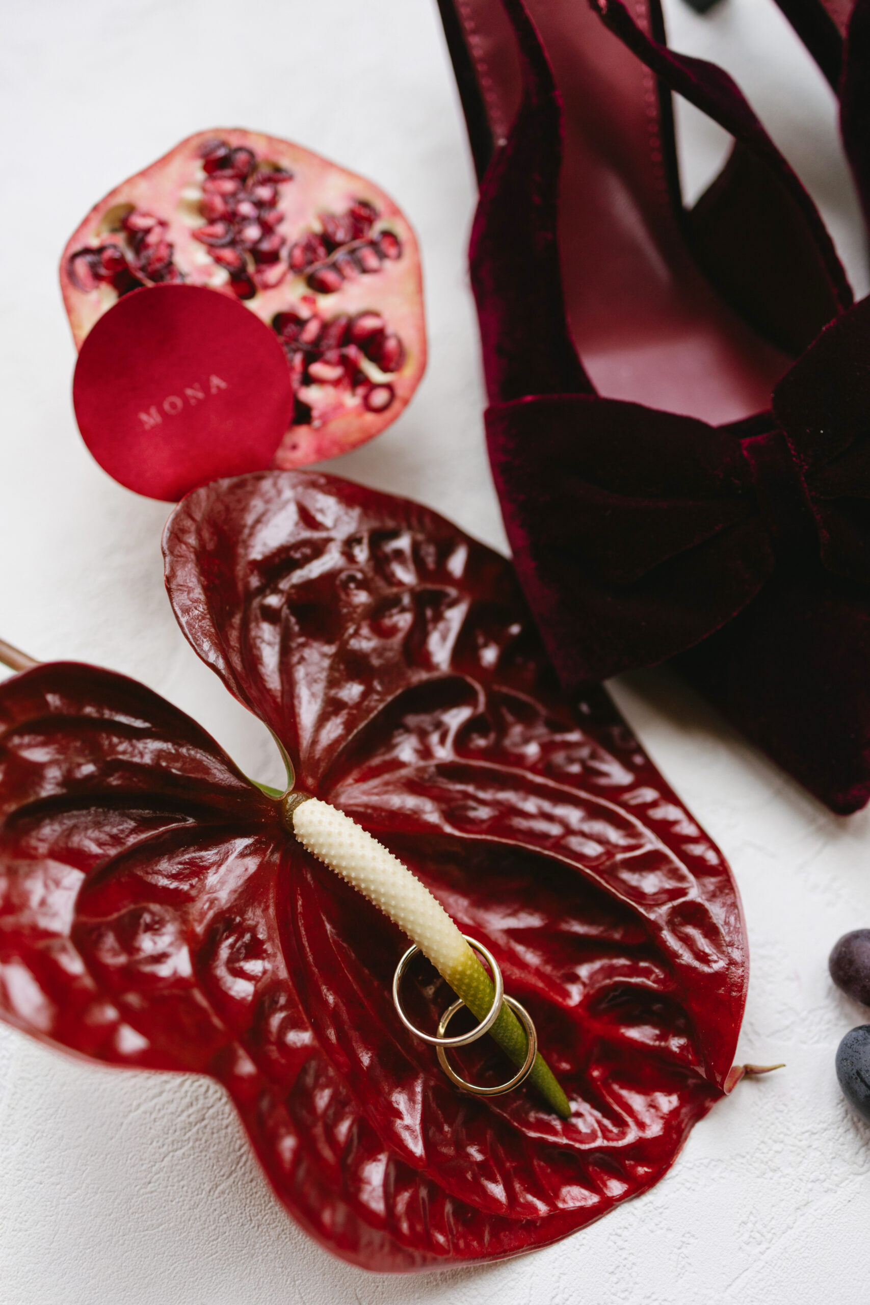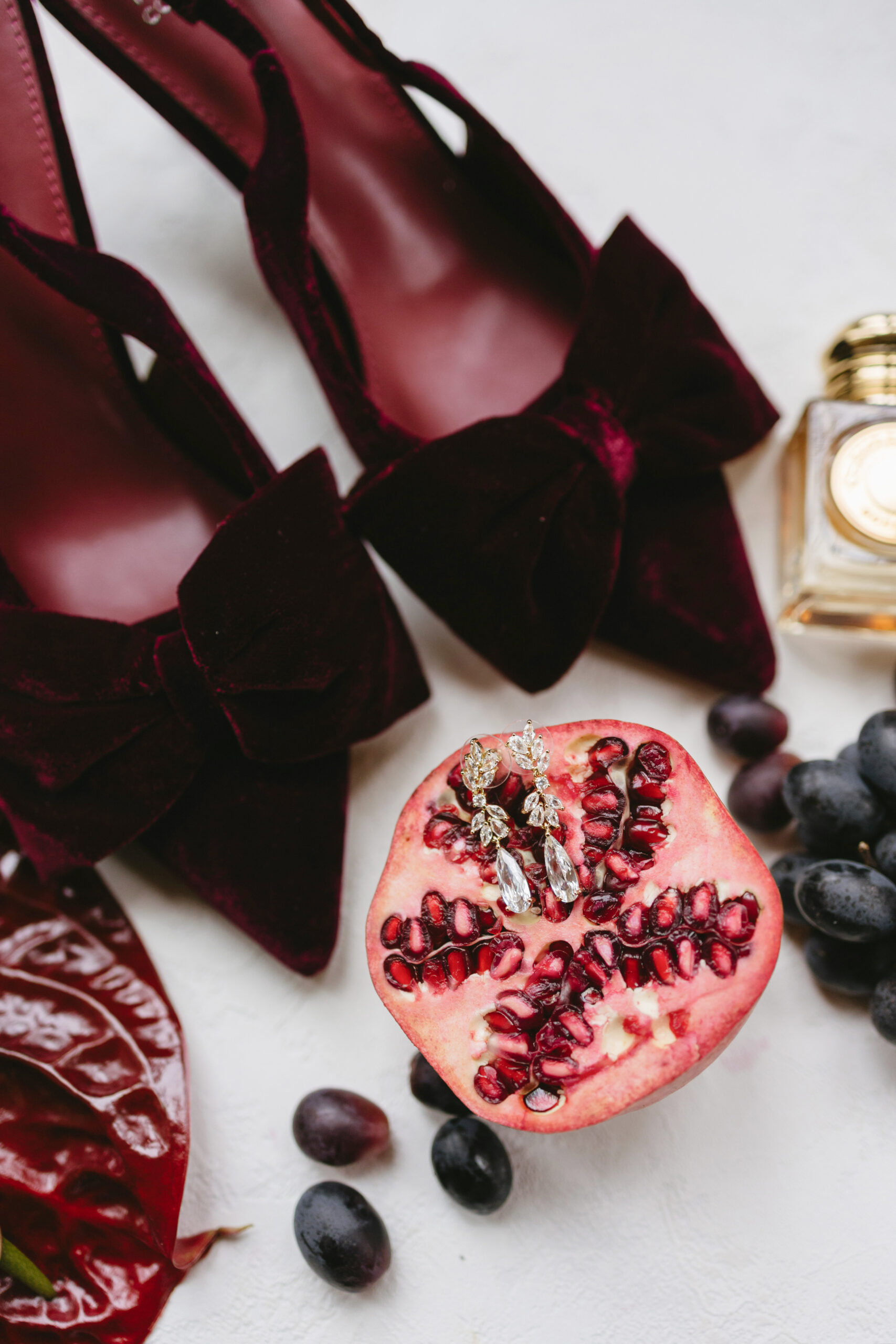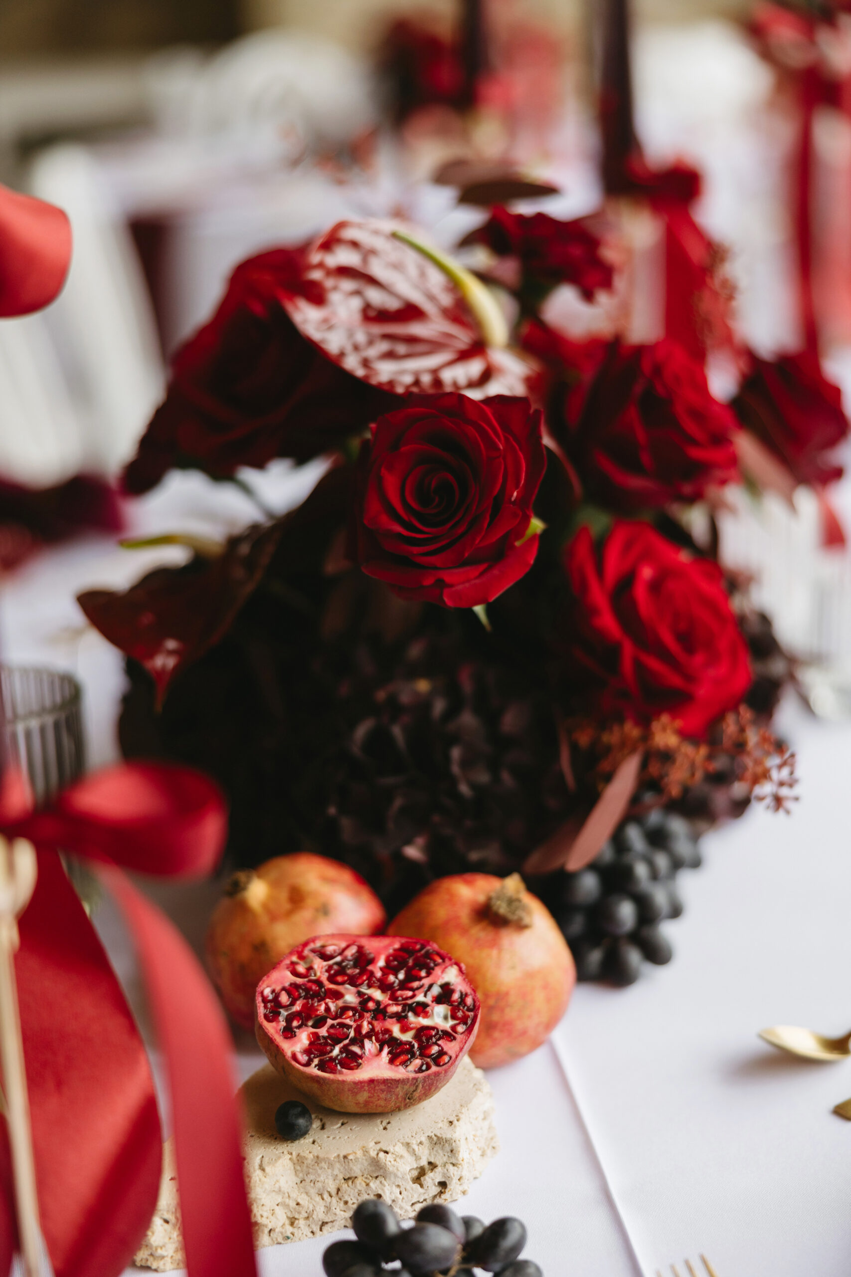 Verziert wird sie mit frischen Granatäpfeln, deren tiefrote Kerne wie kleine Rubinsteine funkeln und dem Design eine sinnliche, warme Tiefe verleihen. Zarte Blüten in Burgundertönen ergänzen die fruchtigen Akzente und schaffen einen harmonischen, luxuriösen Gesamtstil.