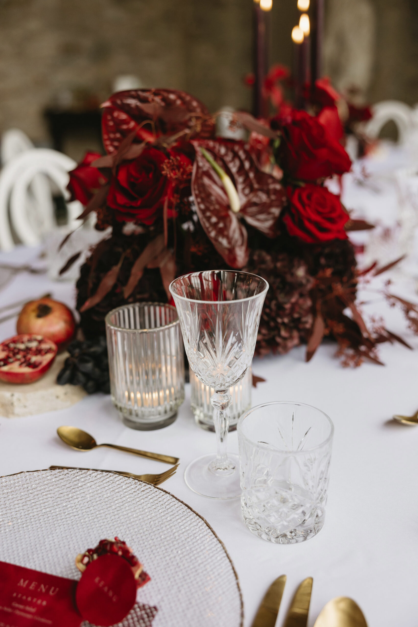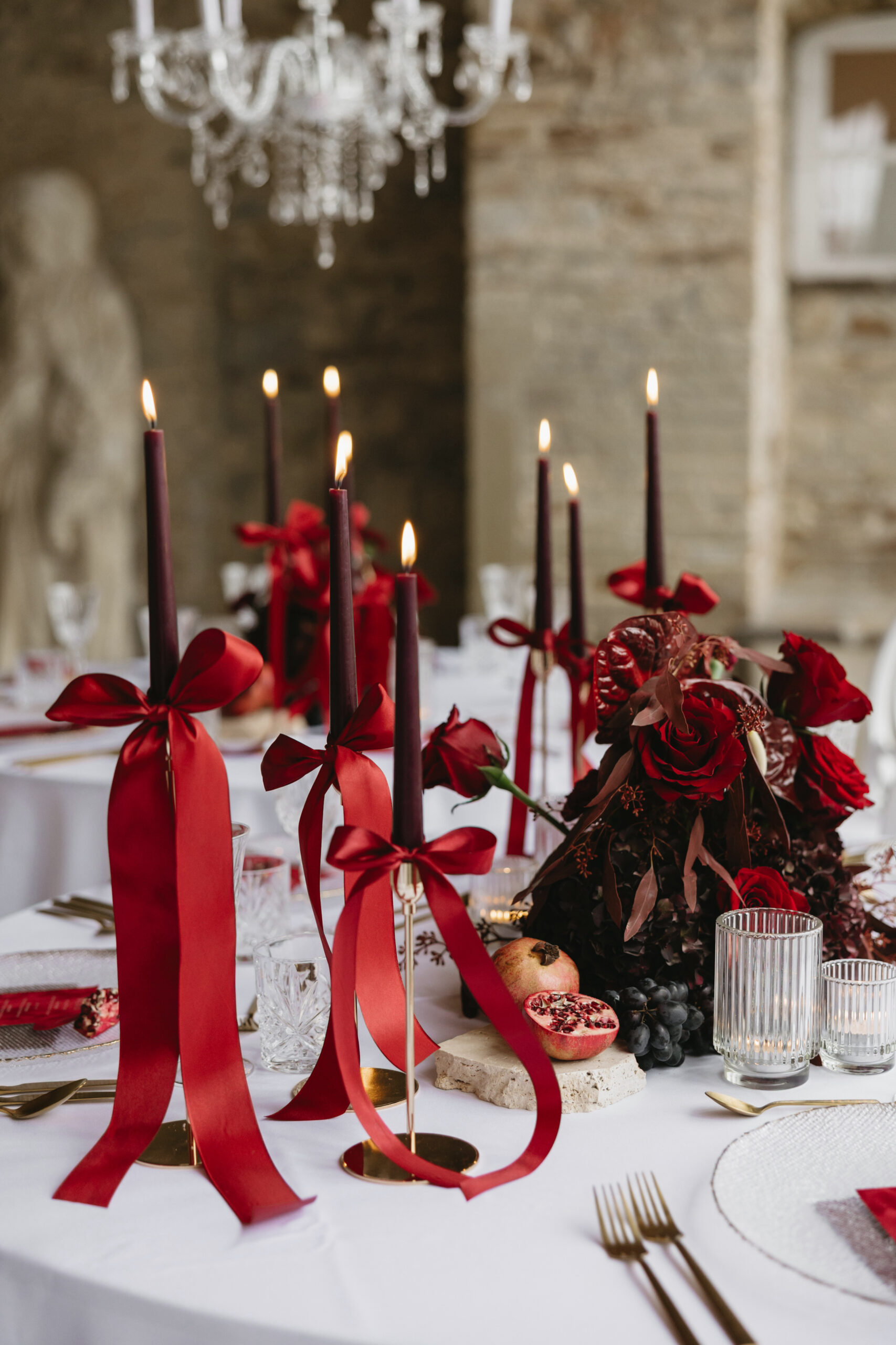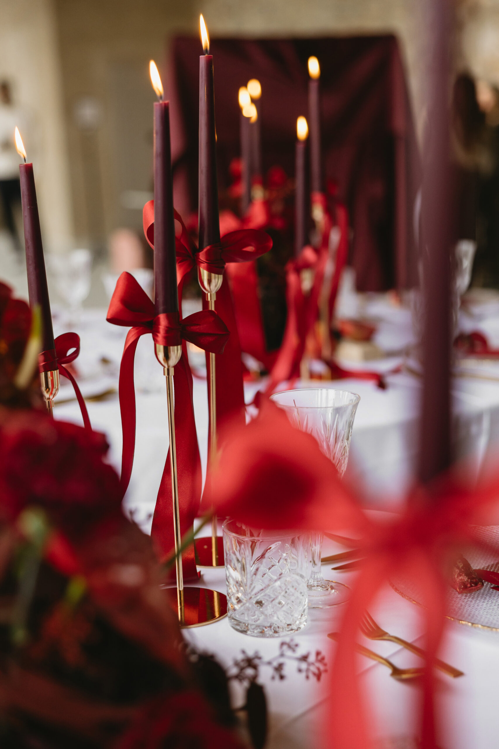 Kerzen in unterschiedlichen Höhen – warm, ruhig und elegant – verleihen dem Setting zusätzliche Tiefe und lassen den Tisch im sanften Glanz erstrahlen. Ein luxuriöses, zugleich modernes Arrangement, das zeigt: Burgunder kann sowohl kraftvoll als auch zart sein, sinnlich, stilvoll und voller Atmosphäre.