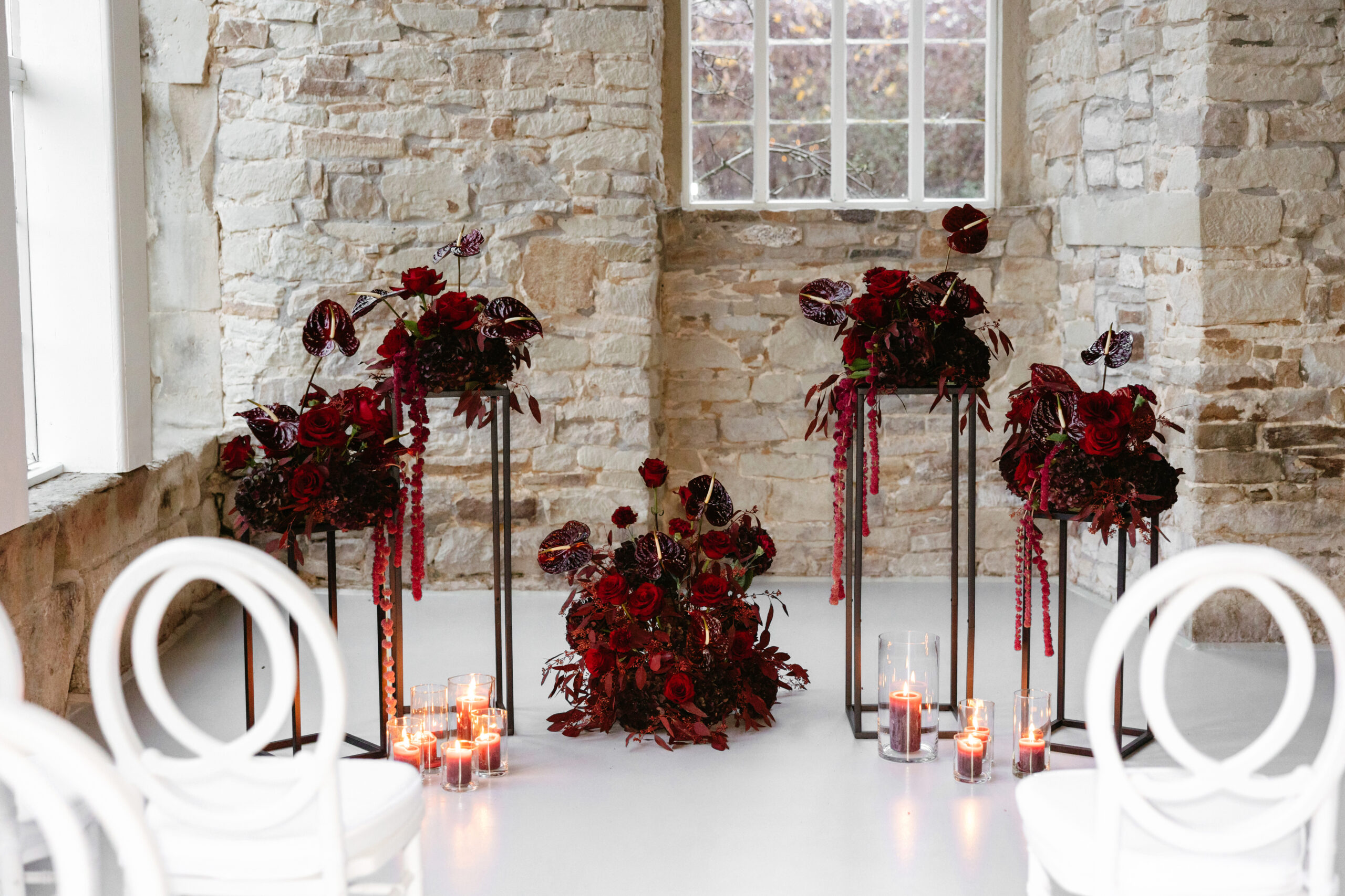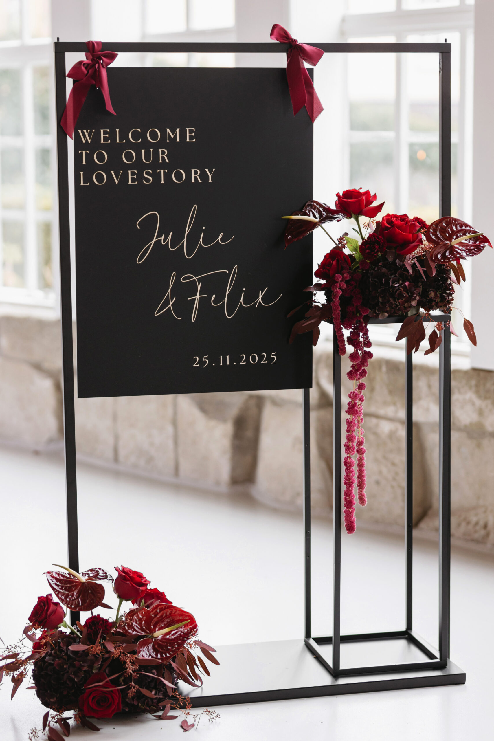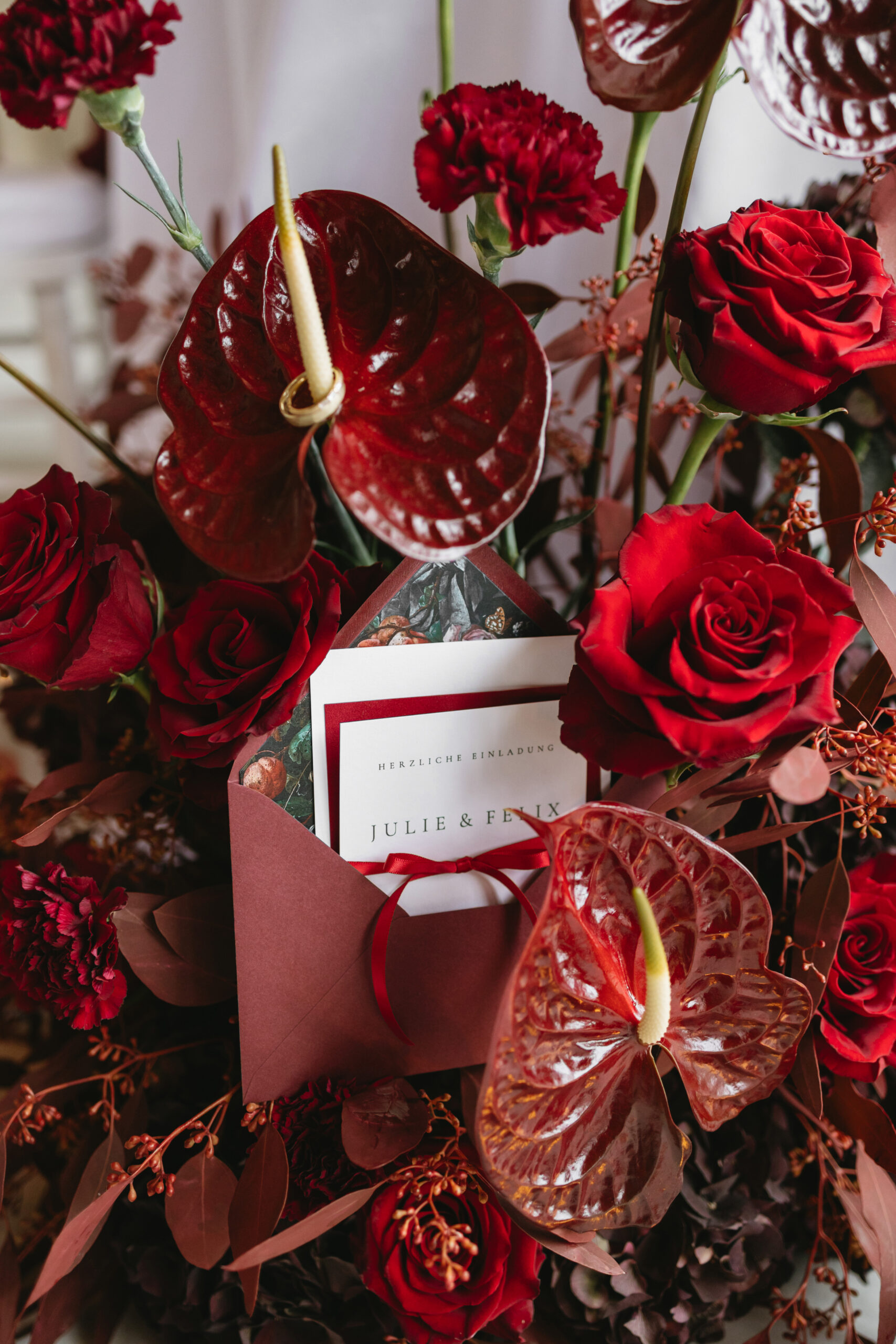 Die Floristik greift das Farbkonzept in tiefem Burgunderrot und warmen Beerentönen auf – eine Kombination, die Intensität, Eleganz und eine warme, sinnliche Atmosphäre erzeugt. Inspiriert von saisonaler Fülle und edlen Farbnuancen entsteht ein florales Gesamtbild, das Tiefe, Charakter und moderne Romantik ausstrahlt.