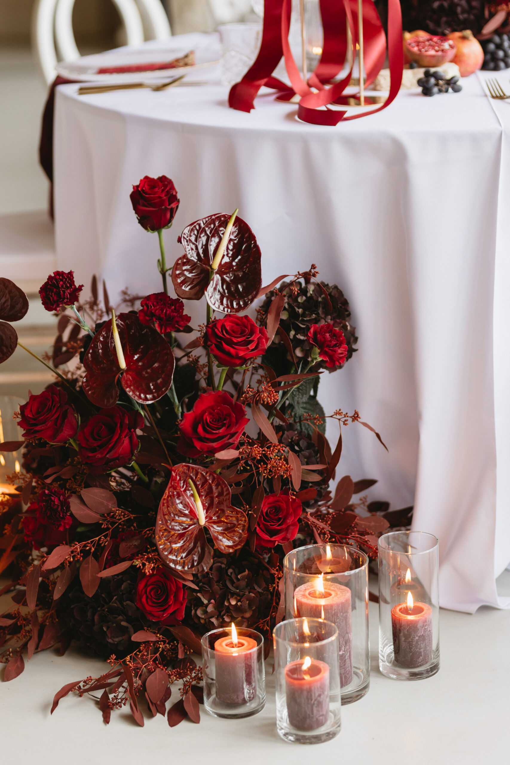 Im Zentrum der langen Tafel stehen üppige, burgunderfarbene Blumengestecke, die der Dekoration Struktur und Tiefe verleihen. Rosen in Wein- und Pflaumentönen sowie Hortensien schaffen eine blühende, atmosphärische Komposition.