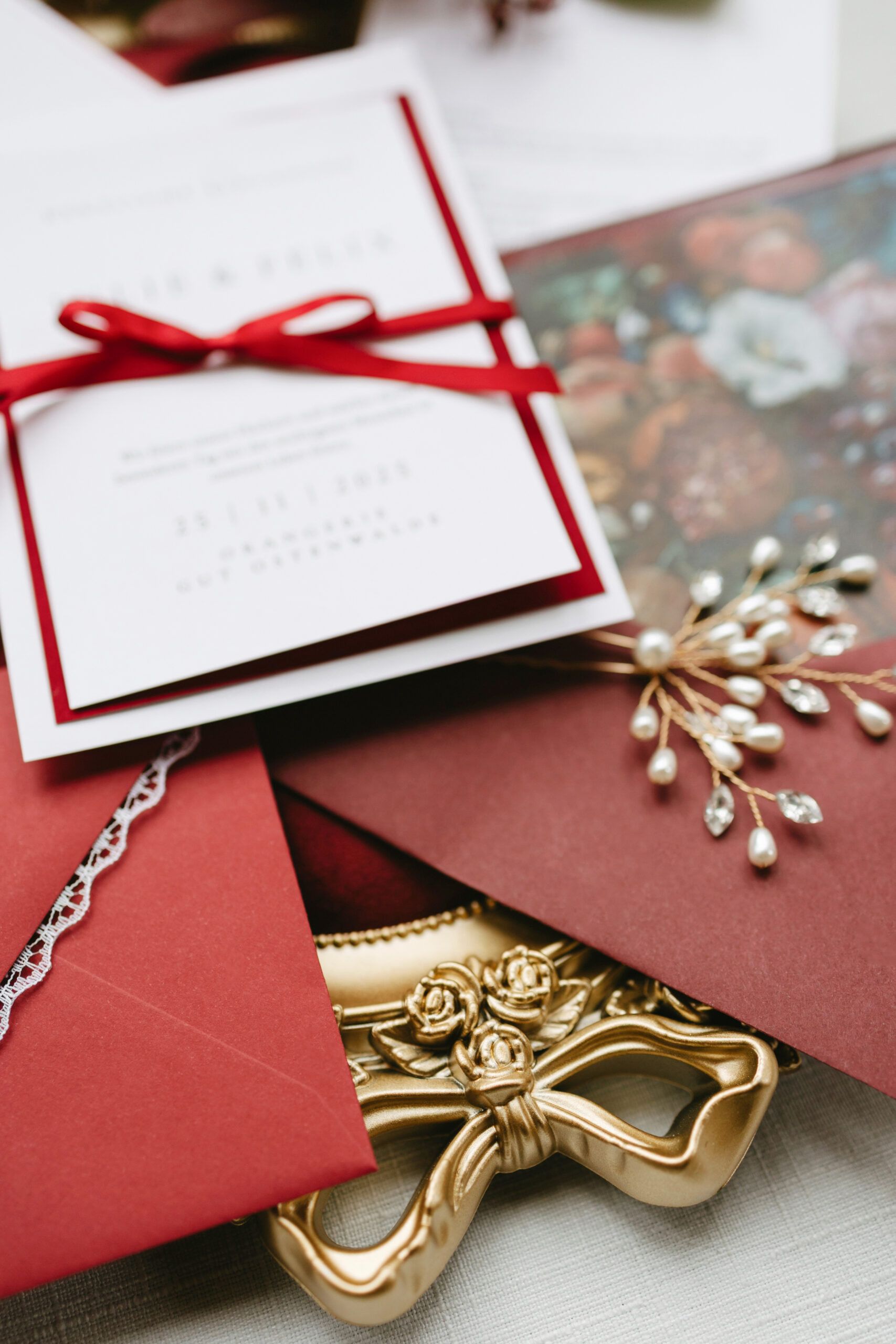 Das Farbkonzept: Tiefes Burgunderrot. Der warme, edle Ton setzt elegante Akzente – kombiniert mit Creme, zarten Naturtönen und goldenen Details entsteht ein harmonisches Gesamtbild voller Tiefe und moderner Romantik.