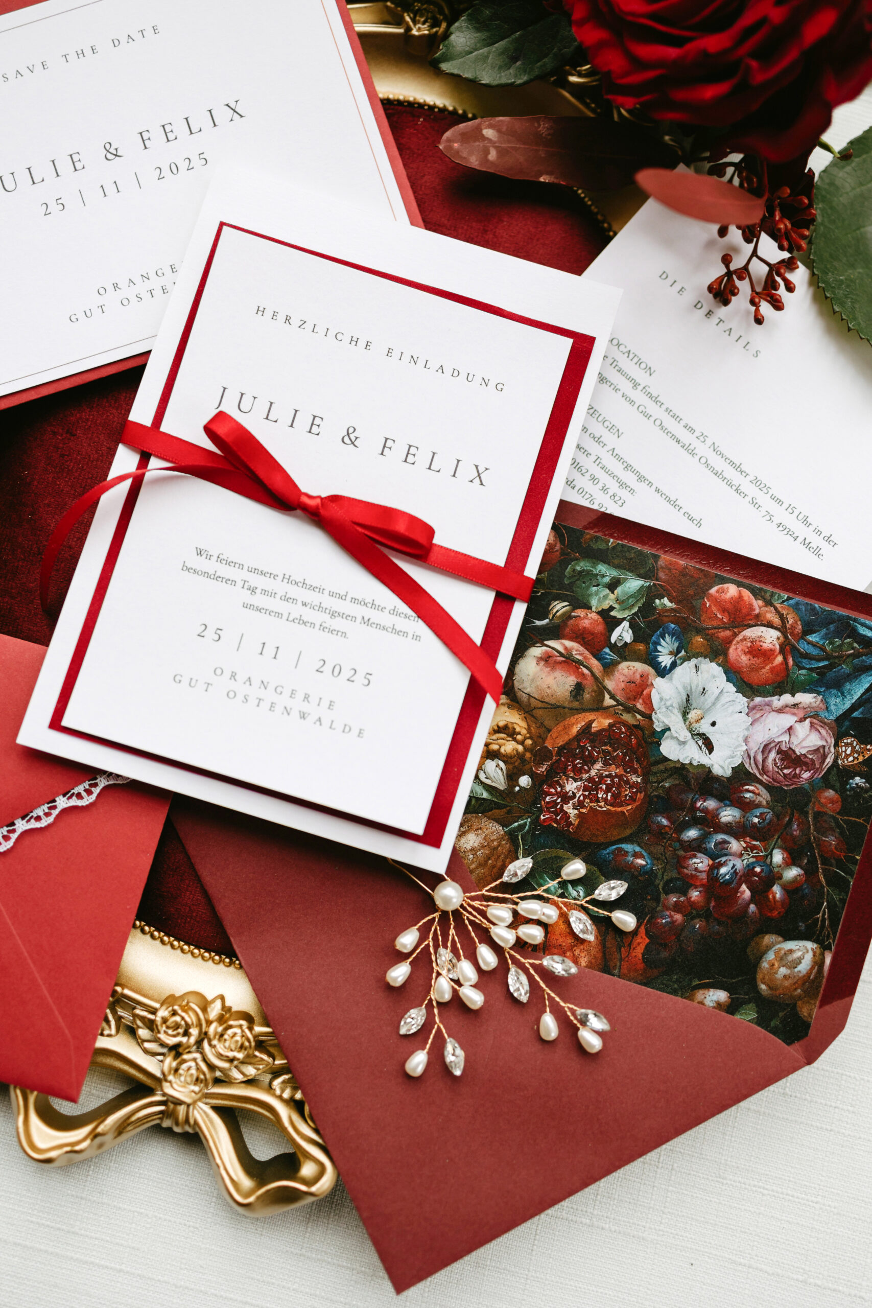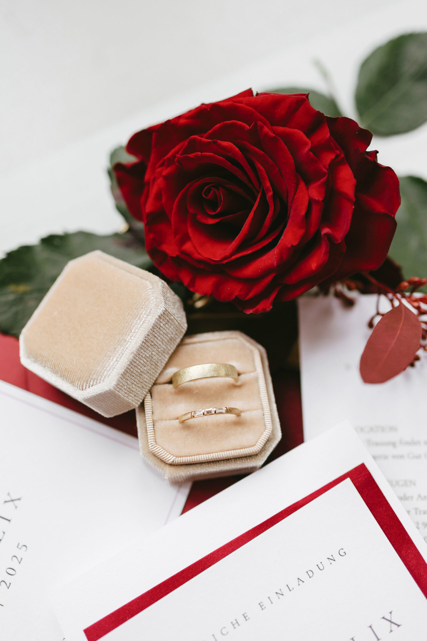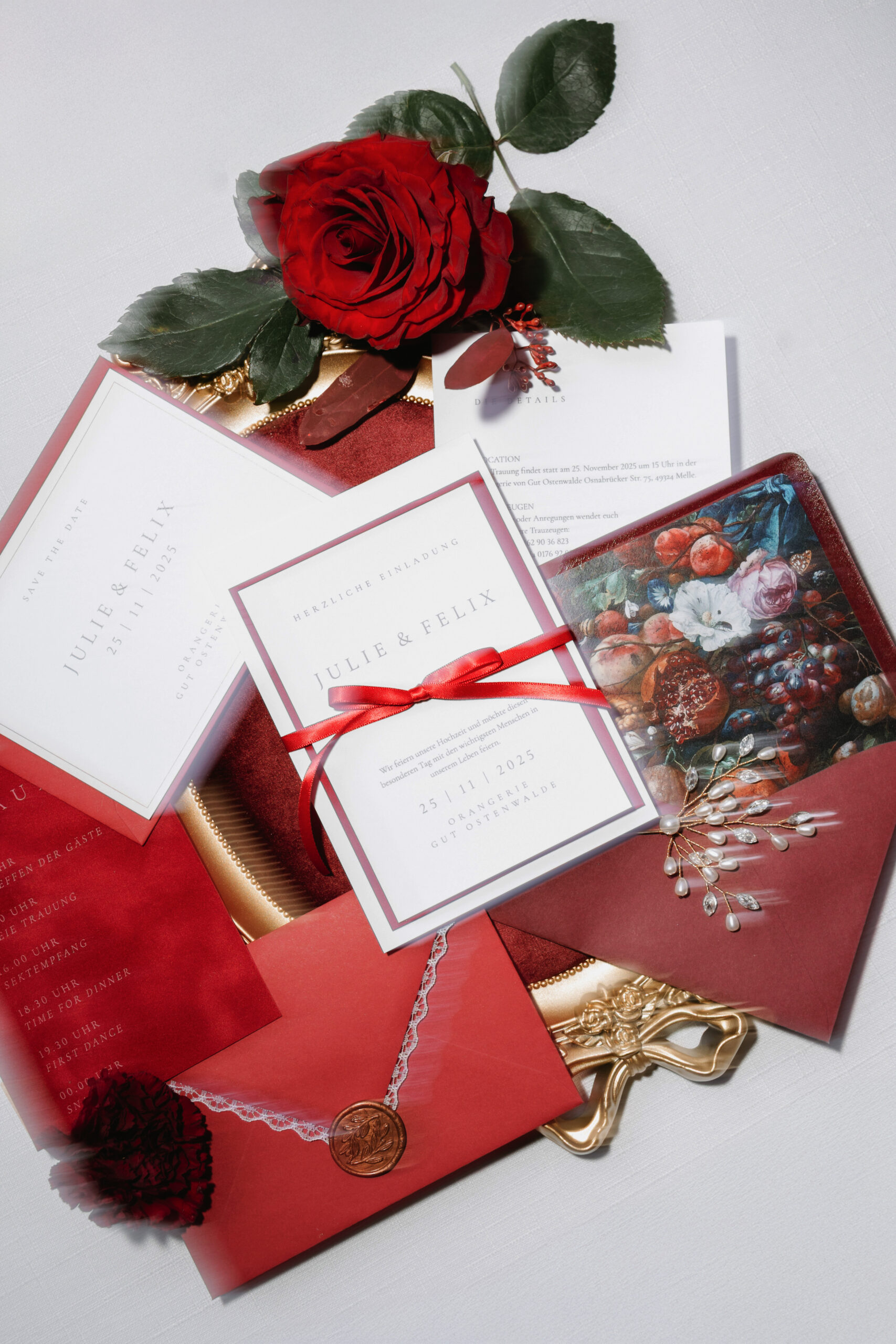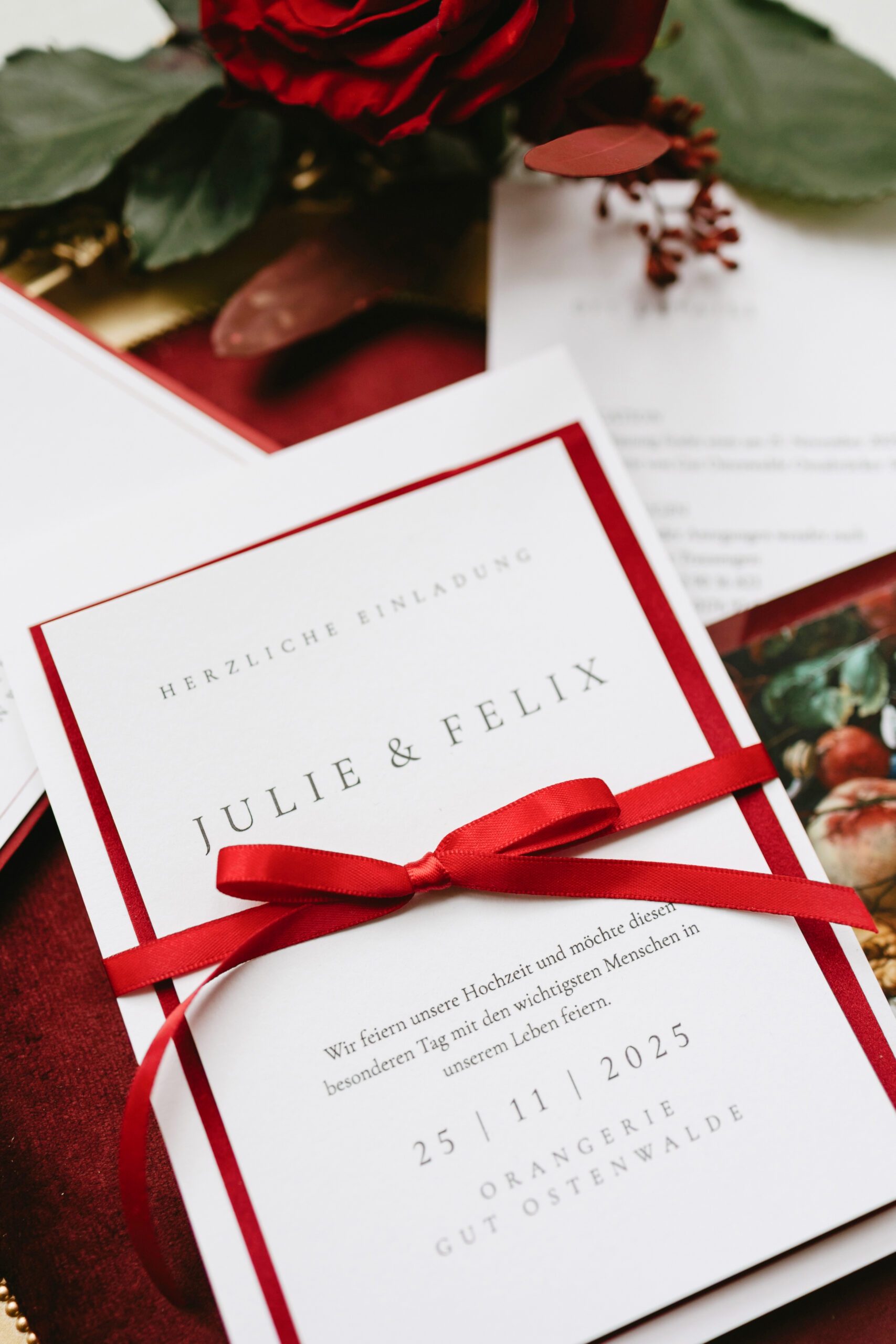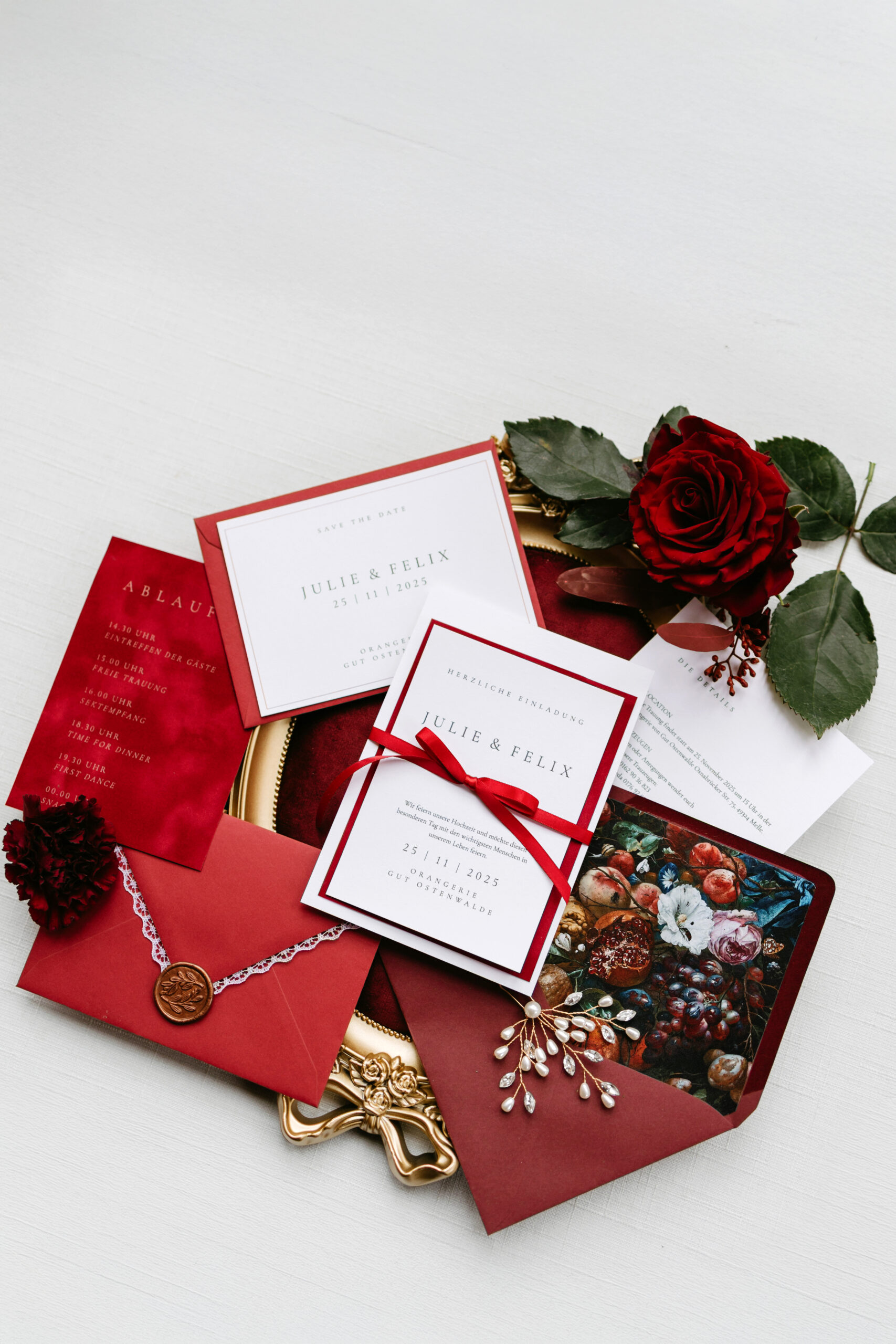 Die Papeterie greift das burgunderrote Farbkonzept mit viel Liebe zum Detail auf: Tiefes Burgunderrot, kombiniert mit cremigen Naturtönen und zartem Weiß, bildet die Grundlage für ein edles, harmonisches Design, das Wärme, Tiefe und moderne Eleganz ausstrahlt.