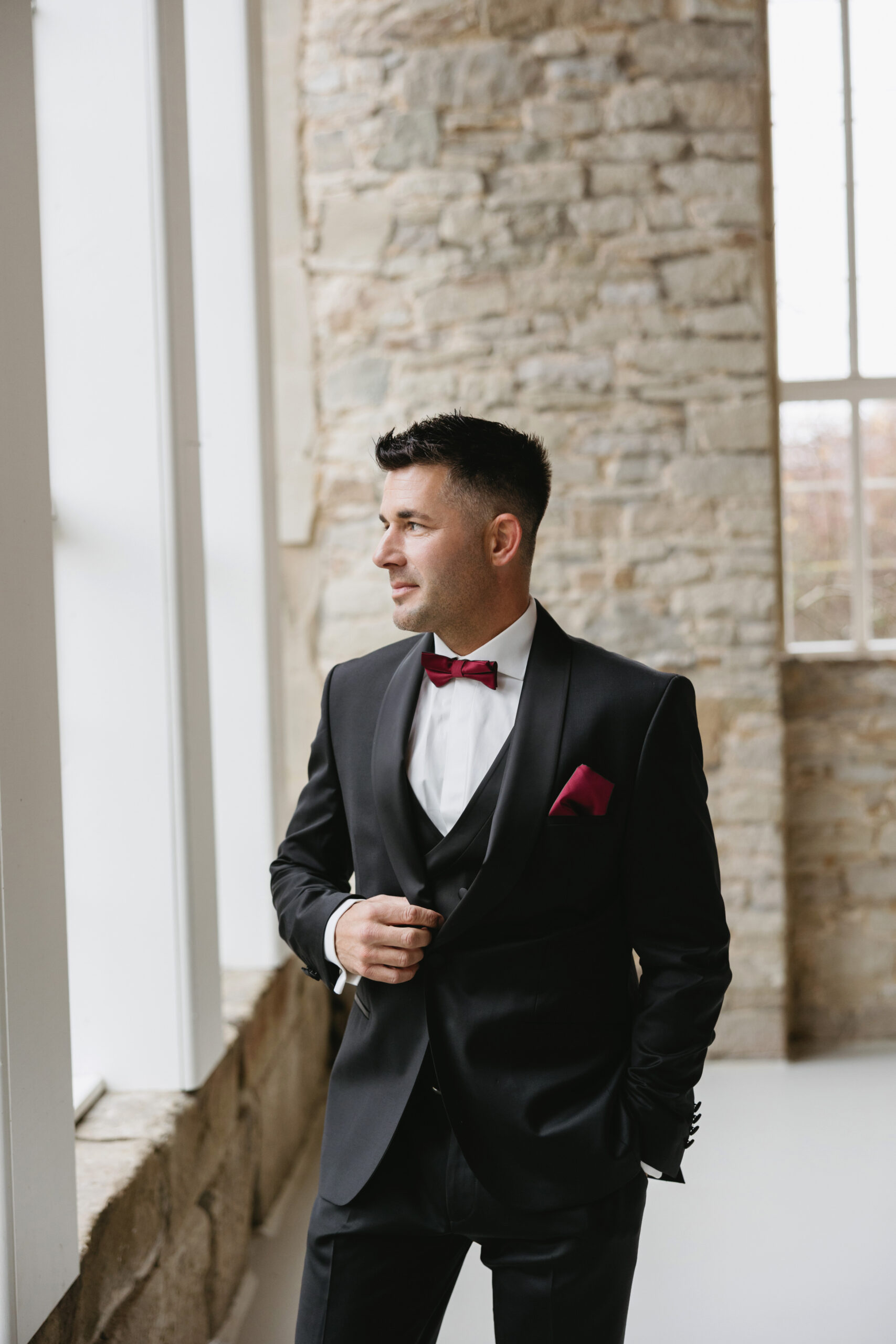Frisuren in weichen Wellen oder edel gesteckten Varianten unterstreichen die Persönlichkeit und vollenden den Look – zurückhaltend, aber wirkungsvoll, perfekt eingebettet in das warme, atmosphärische Burgunder-Konzept.