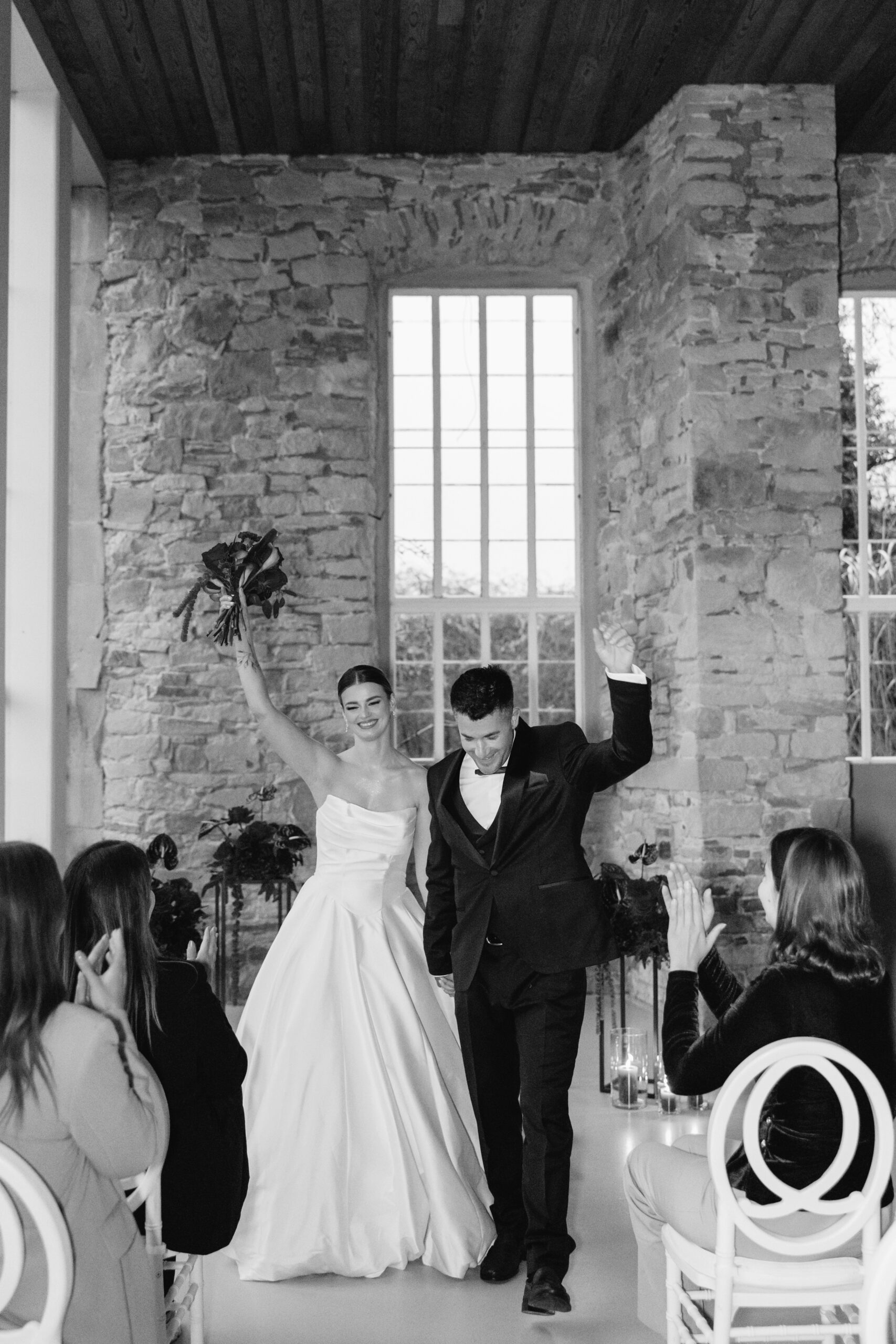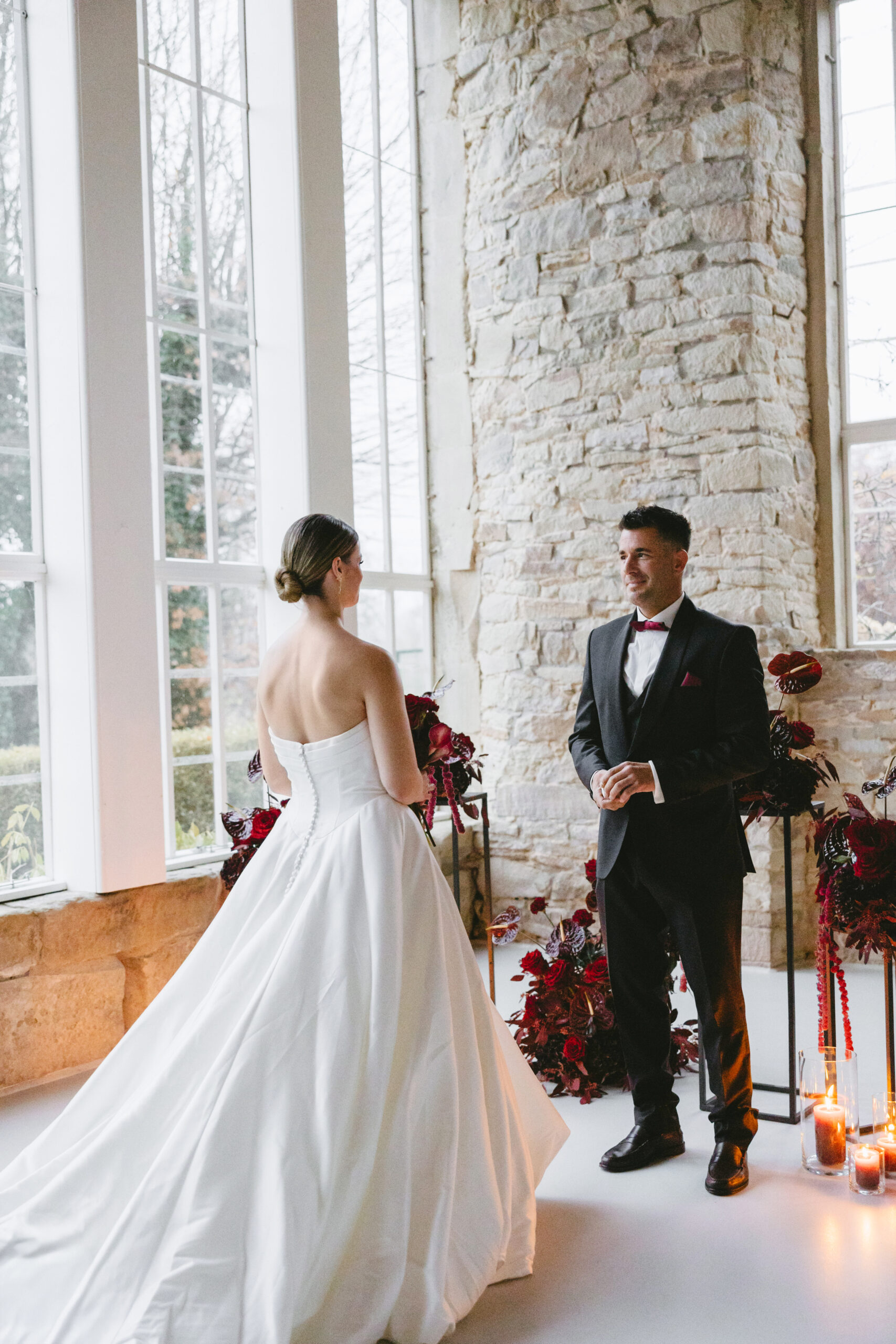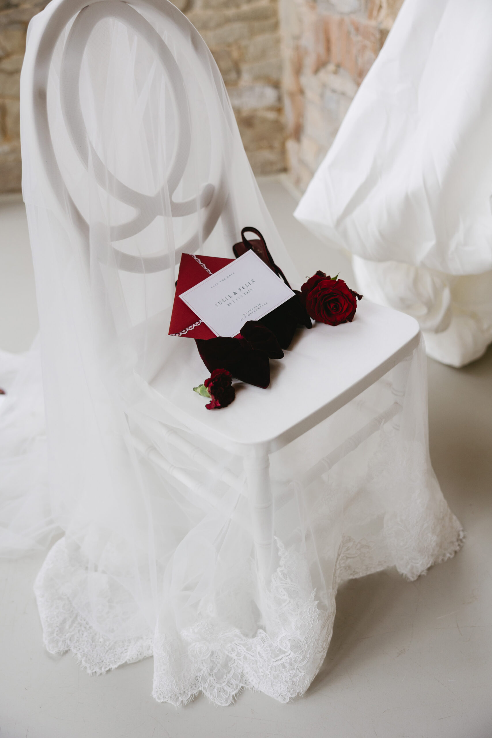 Das Setting wirkt edel und intim zugleich. Burgunderrote Blumenarrangements, Kerzen und sanft schimmernde Stoffe bilden das Herzstück der Zeremonie. Die warmen Farbtöne verschmelzen mit der historischen Architektur der Orangerie und schaffen eine Kulisse, die tief, romantisch und voller Gefühl ist.