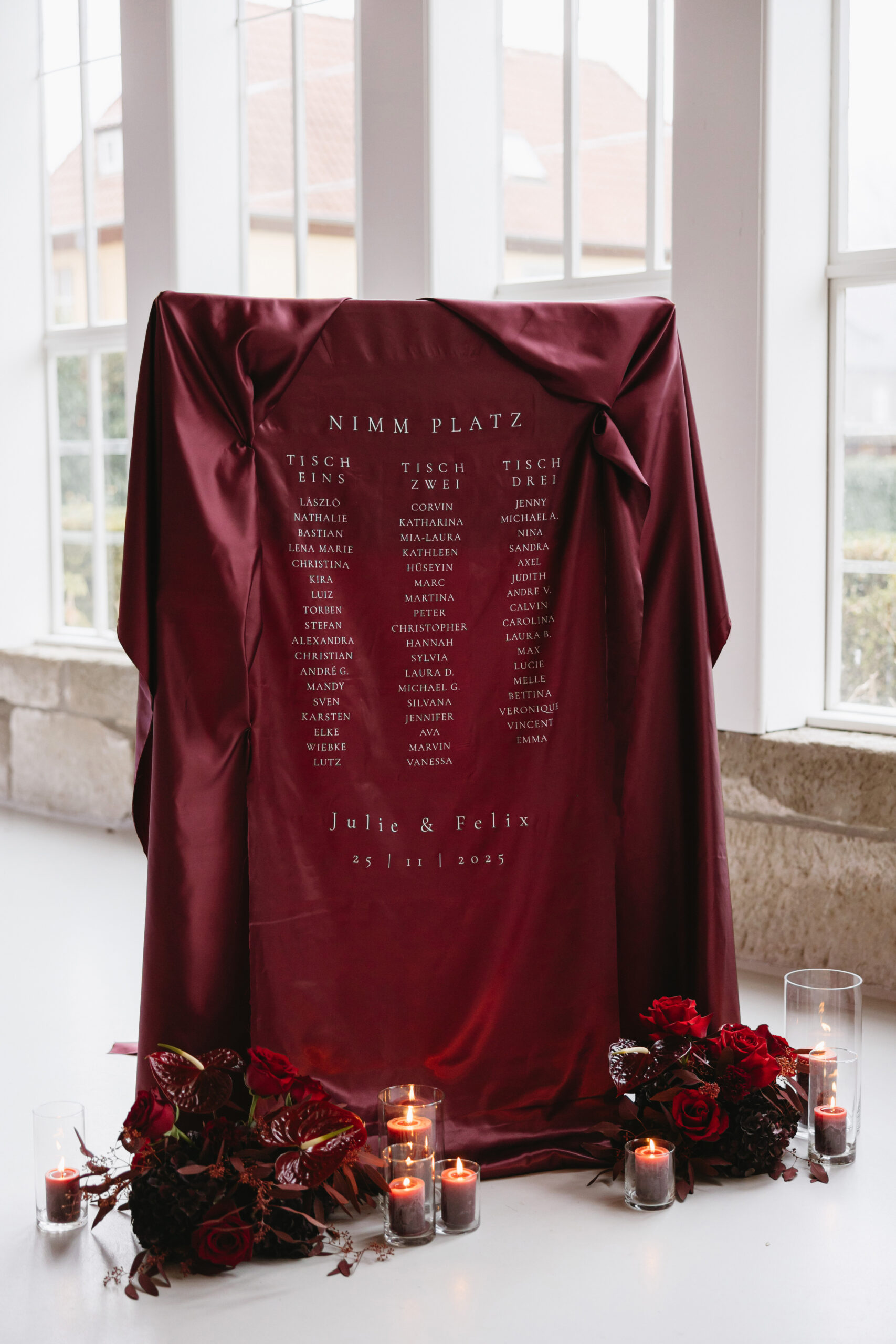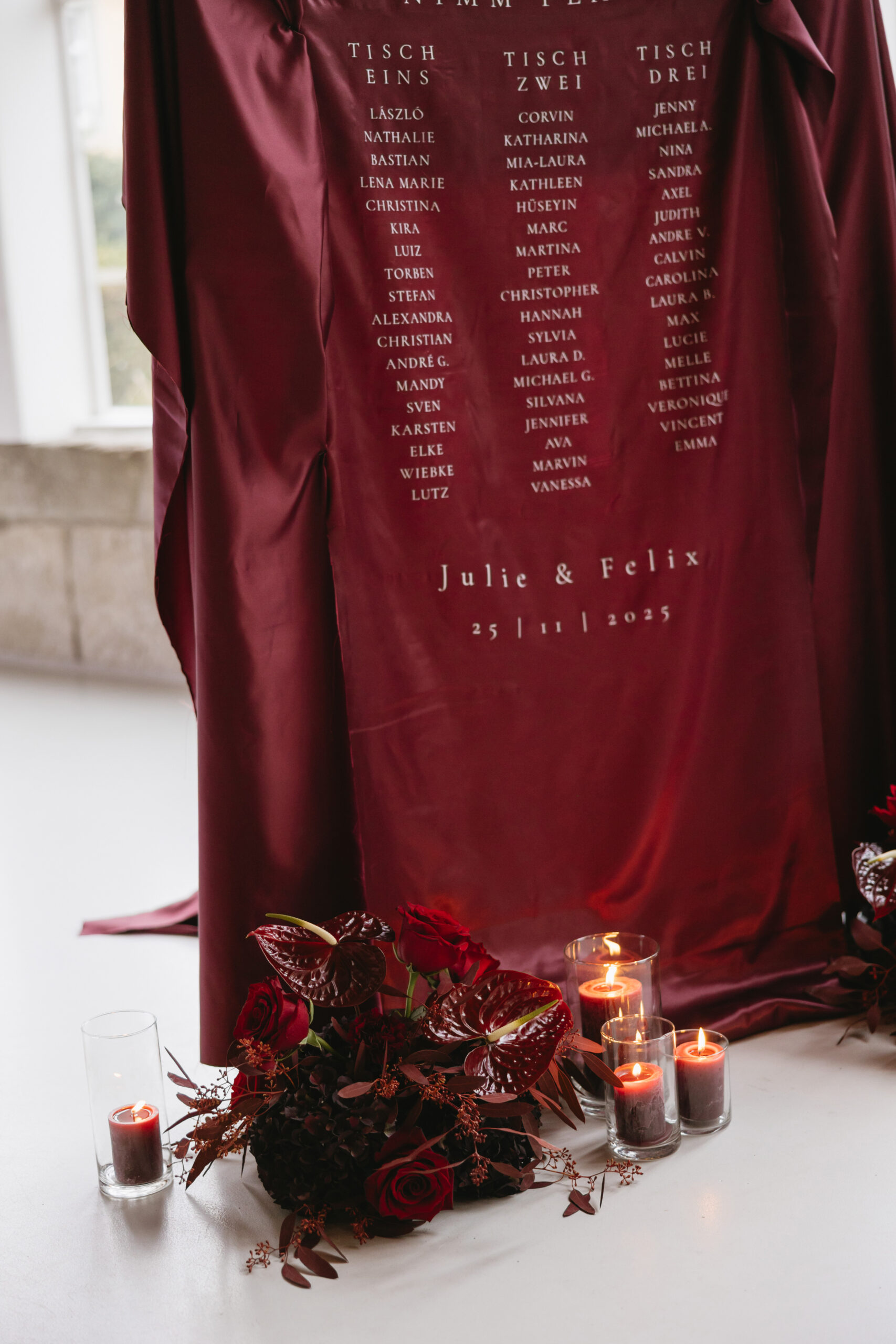 Besondere Highlights sind die burgunderroten Stoffmenükarten und Stoffnamensschilder – ein haptisches Statement, das exklusiv und modern zugleich wirkt. Auch der Sitzplan wird zum Blickfang: ein großes Seidentuch, welches sanft schimmert und die Namen elegant hervorhebt.
