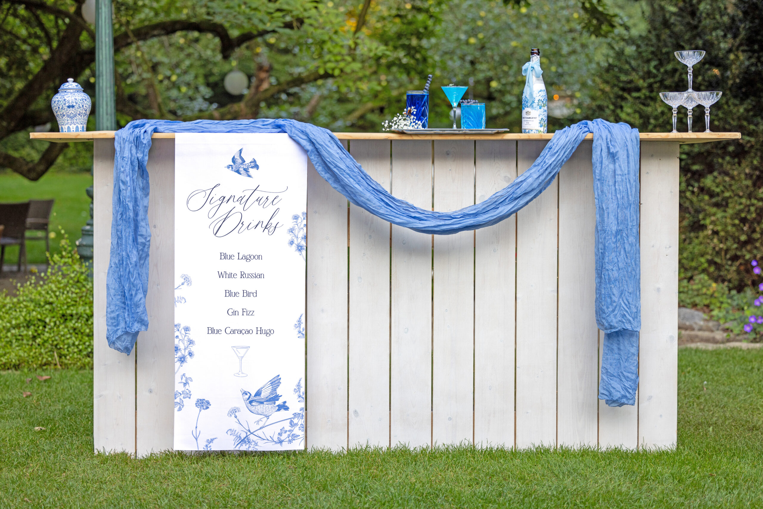Zum stilvollen Empfang werden individuelle Signature Drinks gereicht – perfekt abgestimmt auf das Farbkonzept in Dusty Blue. Die Drinks setzen nicht nur farbliche Akzente, sondern spiegeln auch Persönlichkeit und Stil des Tages wider.