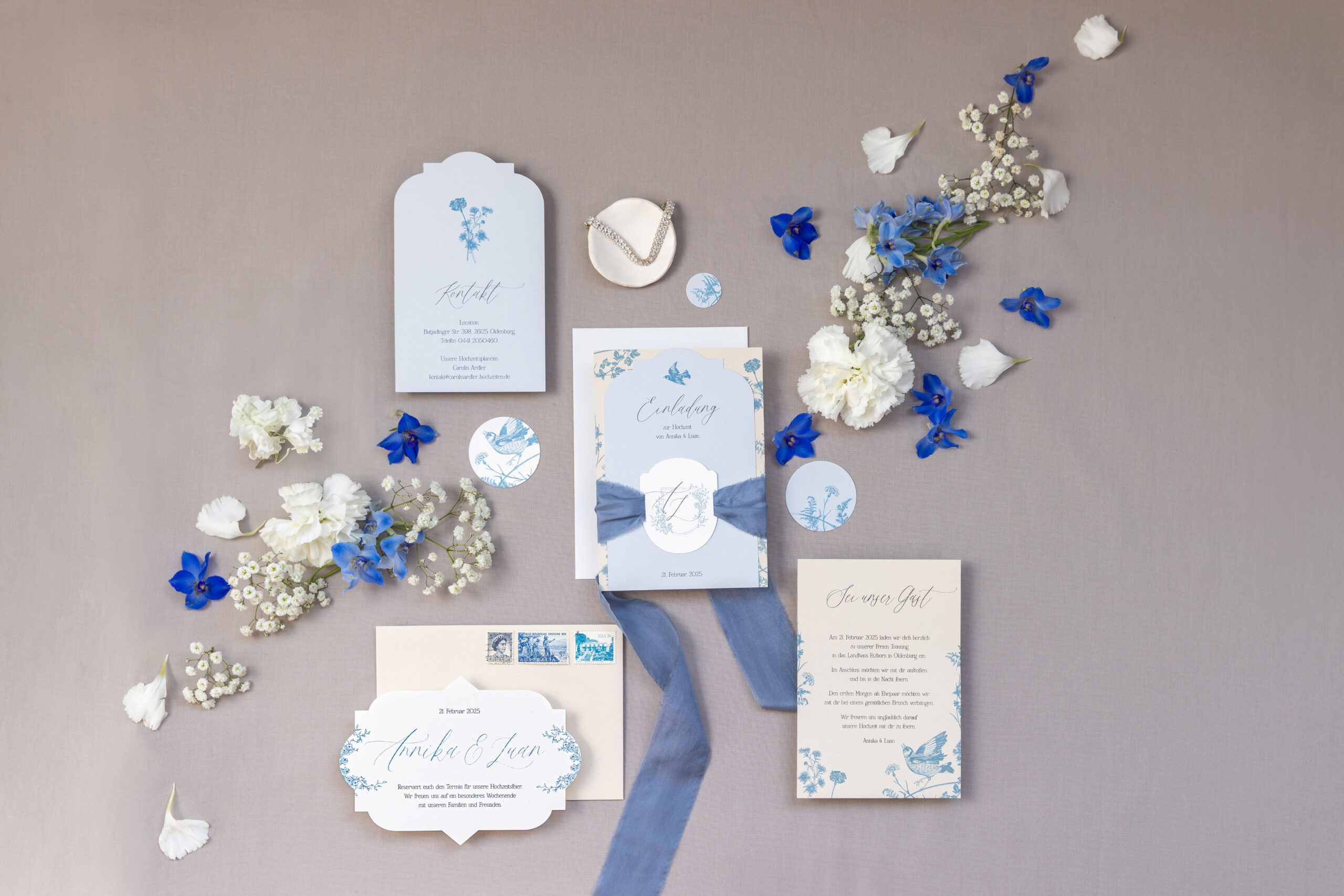 Dresscode Einladungssatz: Blau in all seinen Nuancen – passend zum Farbkonzept in Dusty Blue.