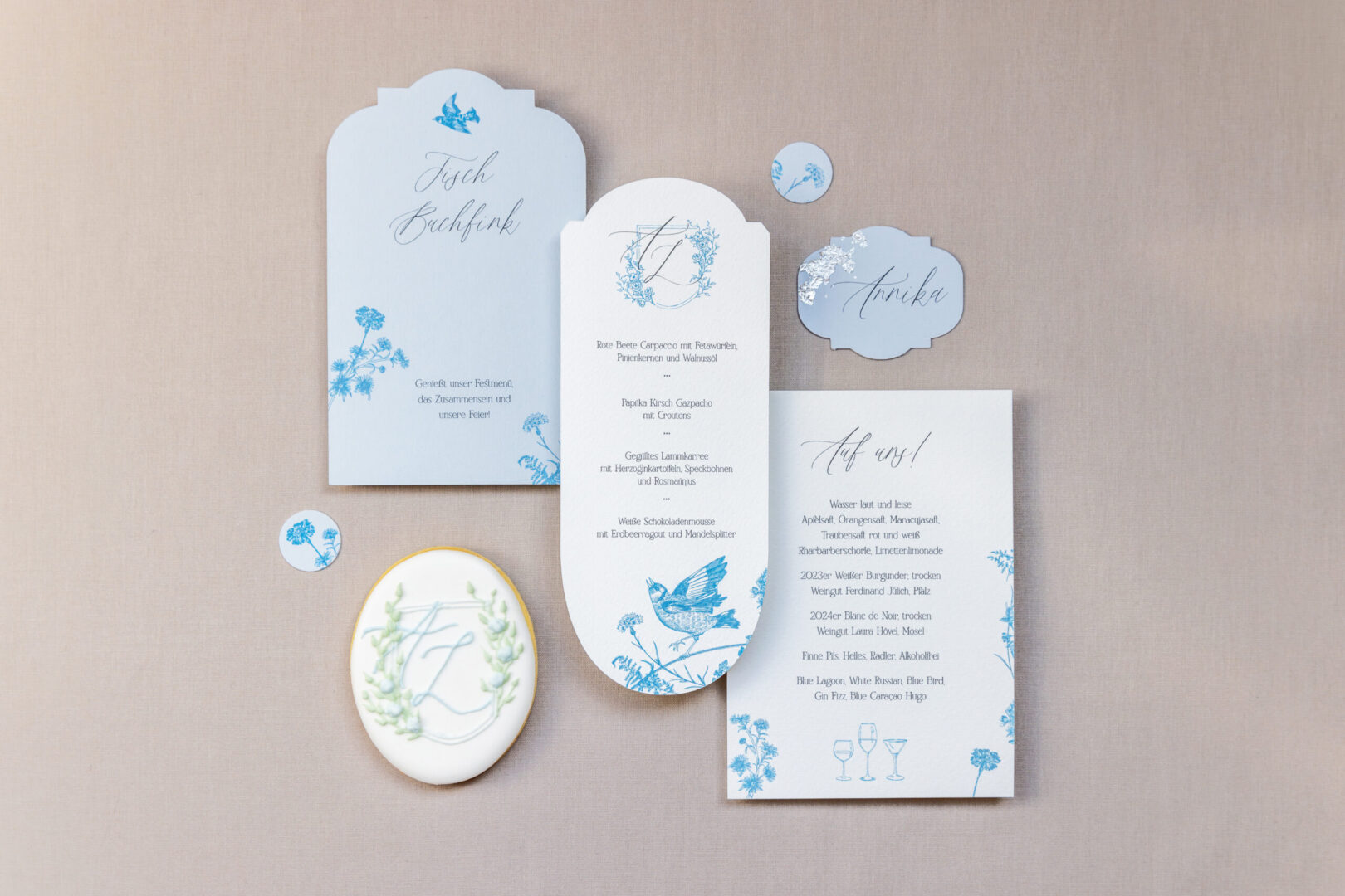 Die Papeterie fügt sich stilvoll in das Dusty Blue Farbkonzept ein – edel, romantisch und liebevoll gestaltet bis ins kleinste Detail. Auf hochwertigem Papier treffen zarte Blautöne mit Creme und Silber auf ein feines, florales Muster, das sich dezent durch Einladungen, Menükarten und Namenskarten zieht. Ein individuelles Logo mit den Initialen des Brautpaares verleiht der Papeterie eine persönliche Note und zieht sich wie ein roter Faden durch das gesamte Design.